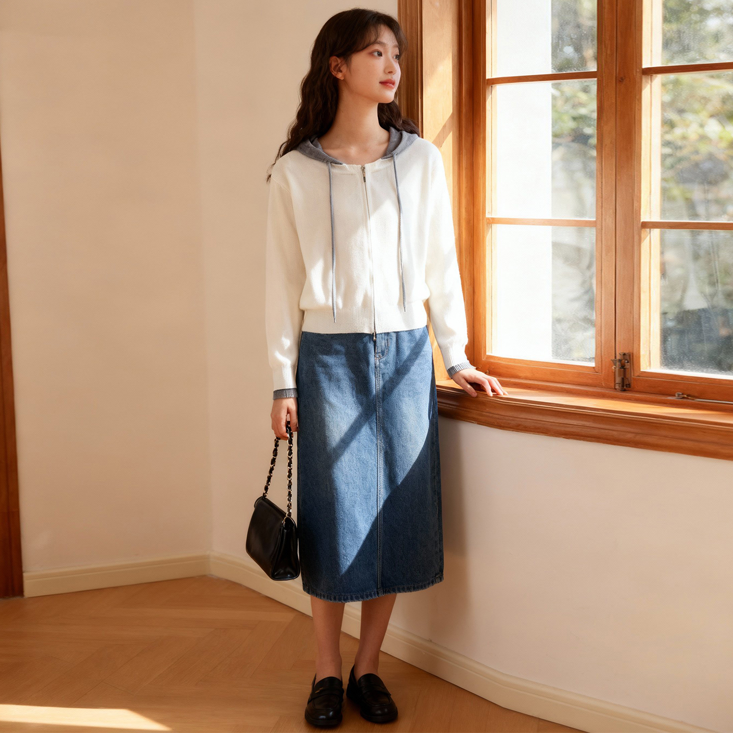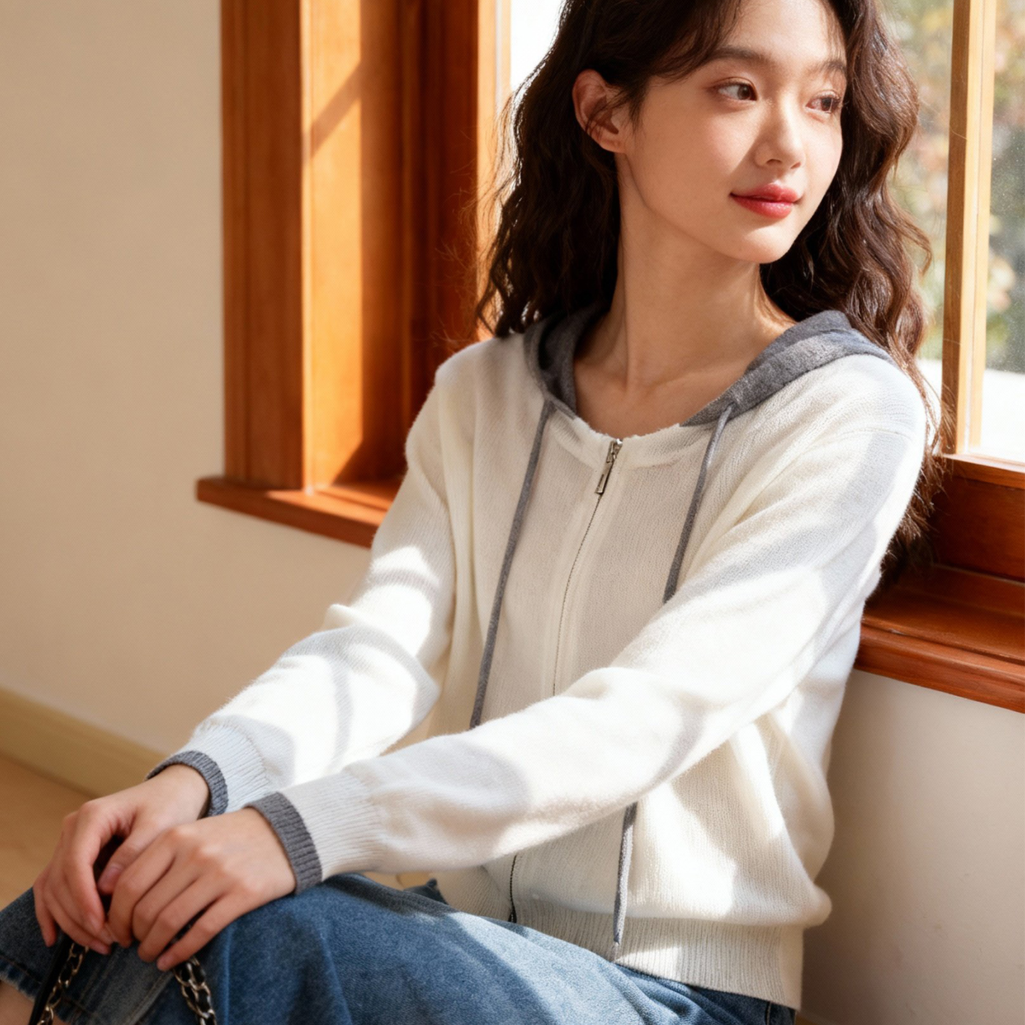 百搭针织上衣 女双拉链宽松时尚 ROCOCO 洛可可莱赛尔撞色连帽开衫