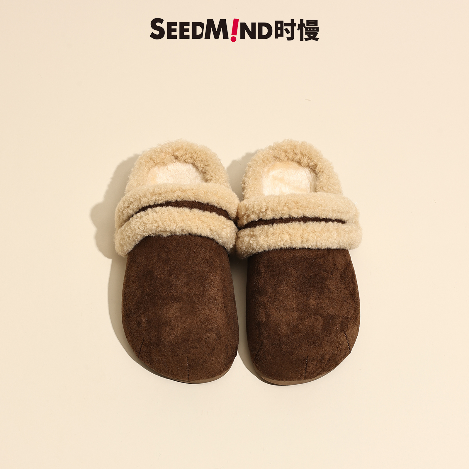 时慢2025秋冬毛绒绒复古棉拖鞋 女外穿保暖加绒厚底两穿包头豆豆鞋