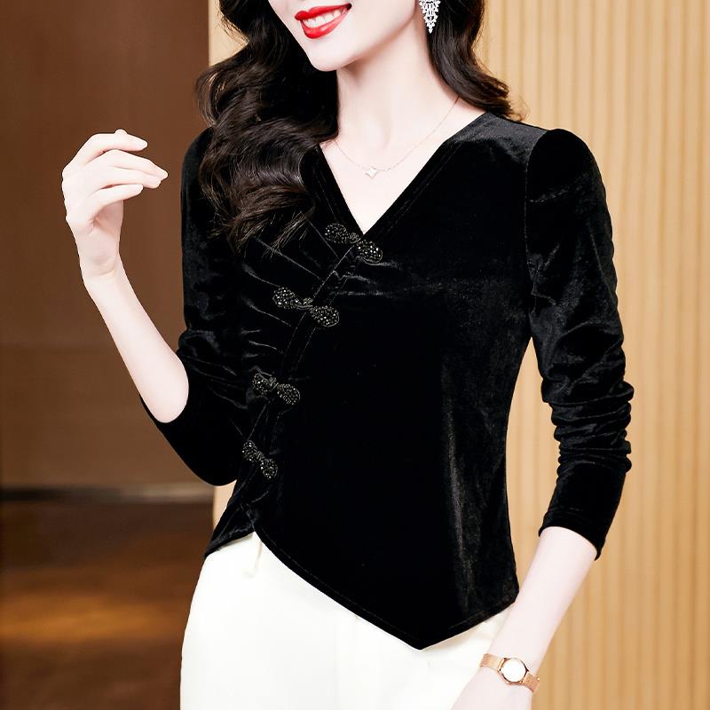 内搭打底衫 好看国风小衫 减龄上衣1003h t恤女式 交叉v领气质长袖
