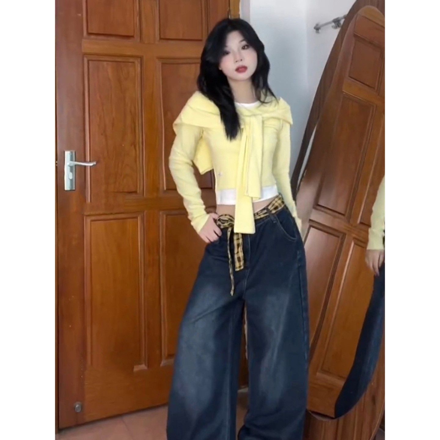 韩系黄色披肩圆领长袖 高级感气质休闲甜妹上衣 t恤女2025春秋新款