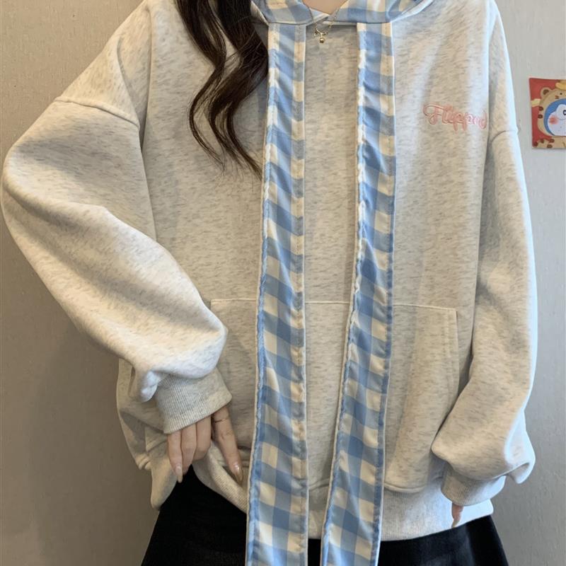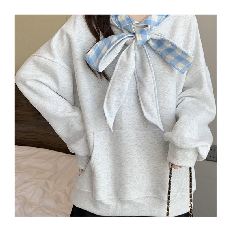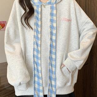 好货宽松慵懒风连帽卫衣打底衫 胖mm格子系带蝴蝶结 女春秋2025大码
