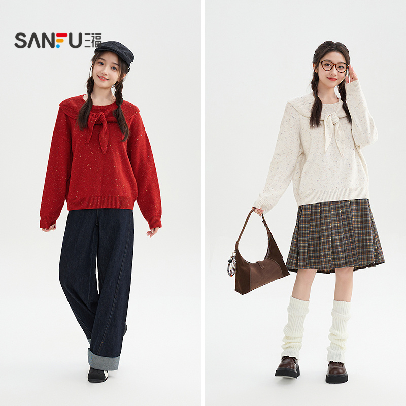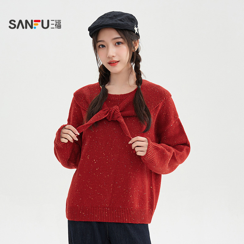 510502 小个子小猫图案圆领宽松套头上衣女装 三福毛衣2025新款 冬季