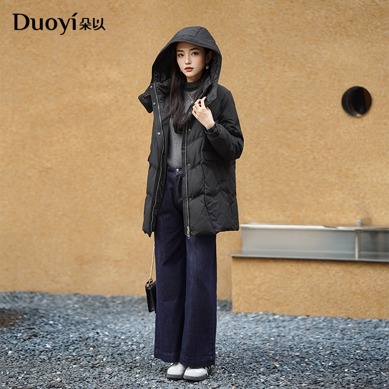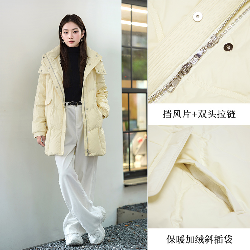 连帽羽绒服保暖外套 韩系简约温柔加绒口袋中长款 朵以2025冬季 新款