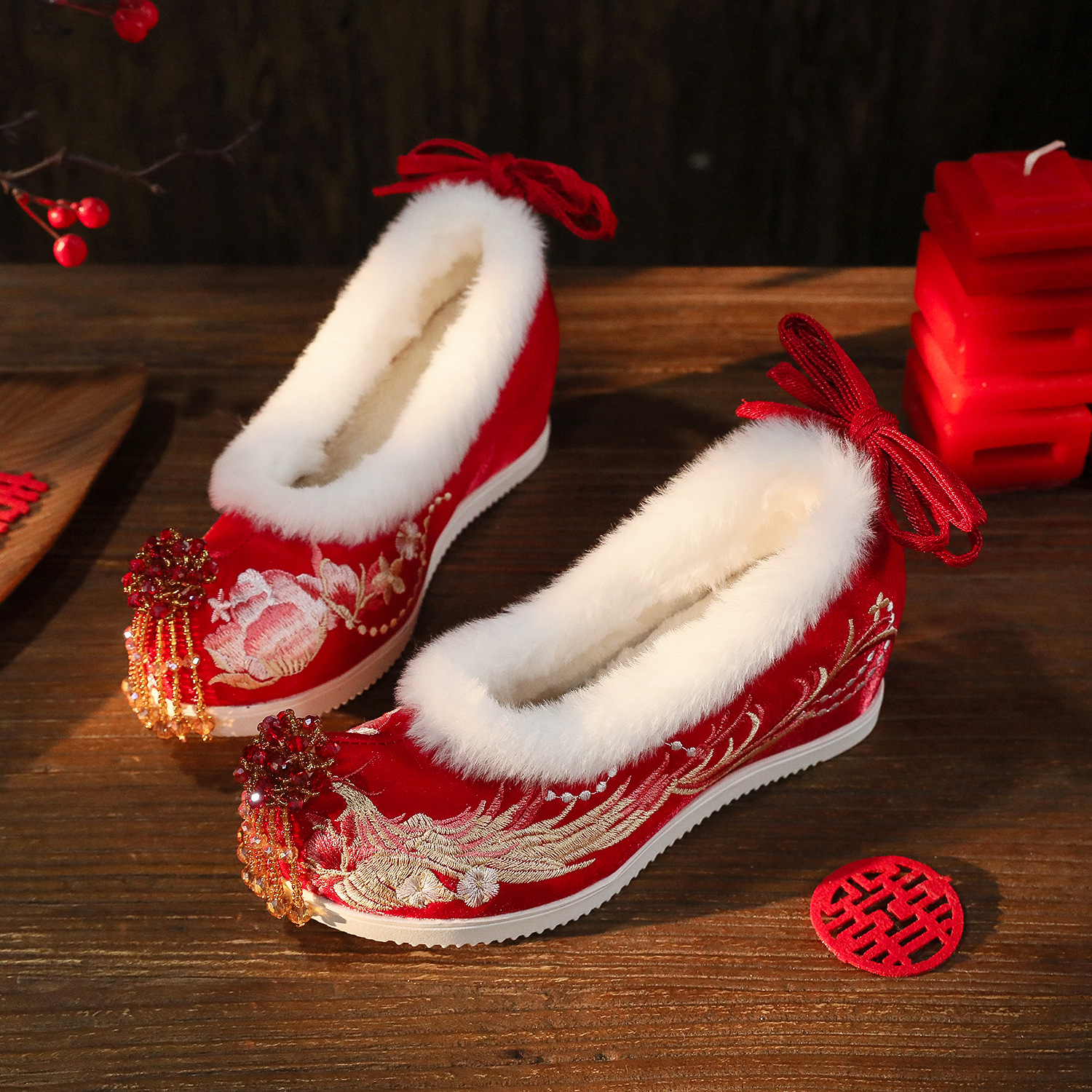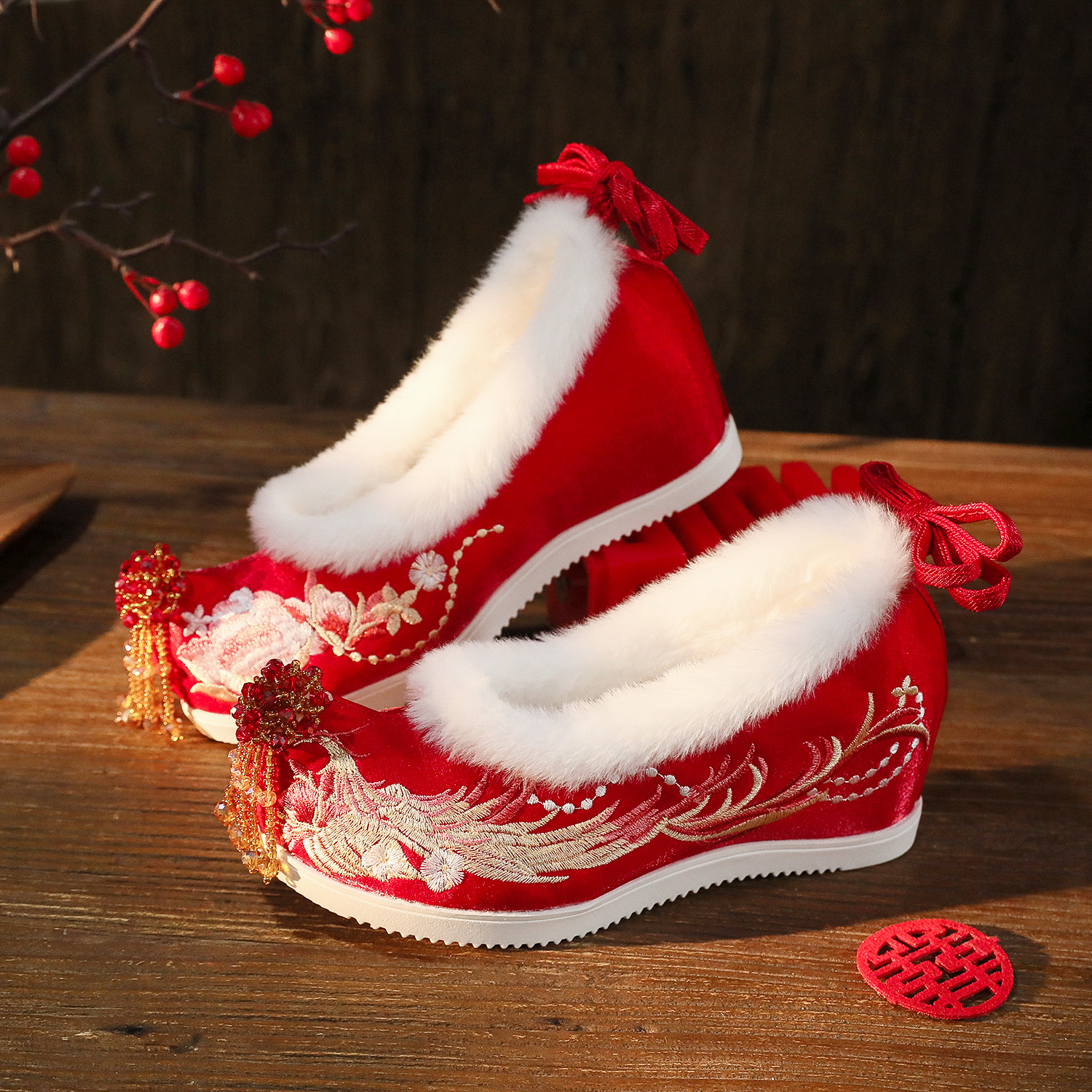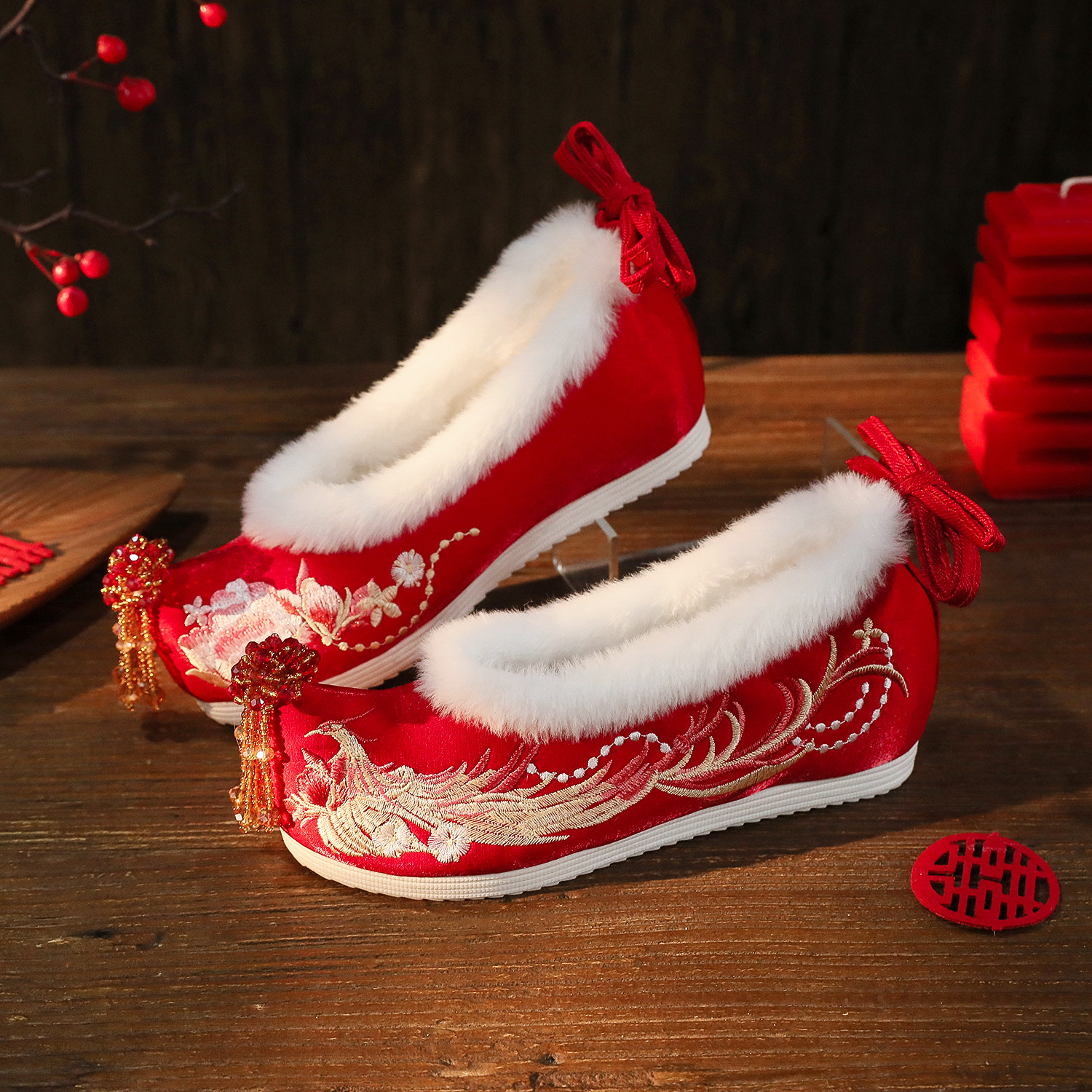 女冬季 秀禾鞋 加绒保暖棉鞋 子红色中式 明制婚礼结婚鞋 古风汉服婚鞋