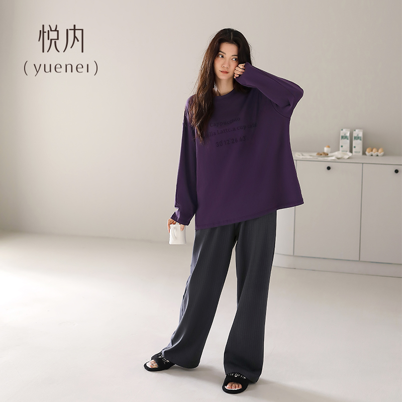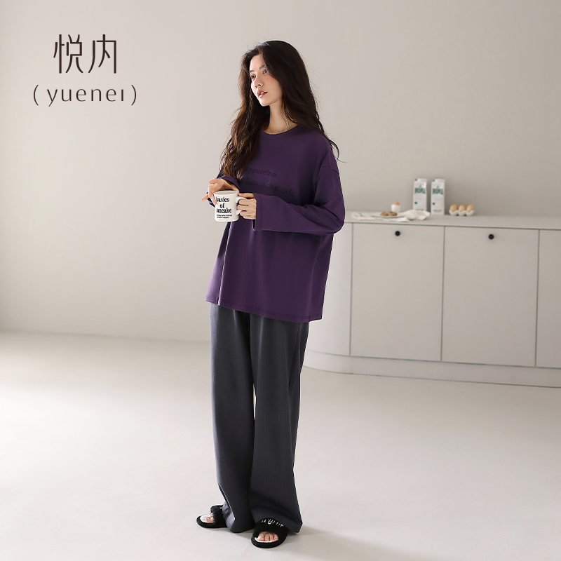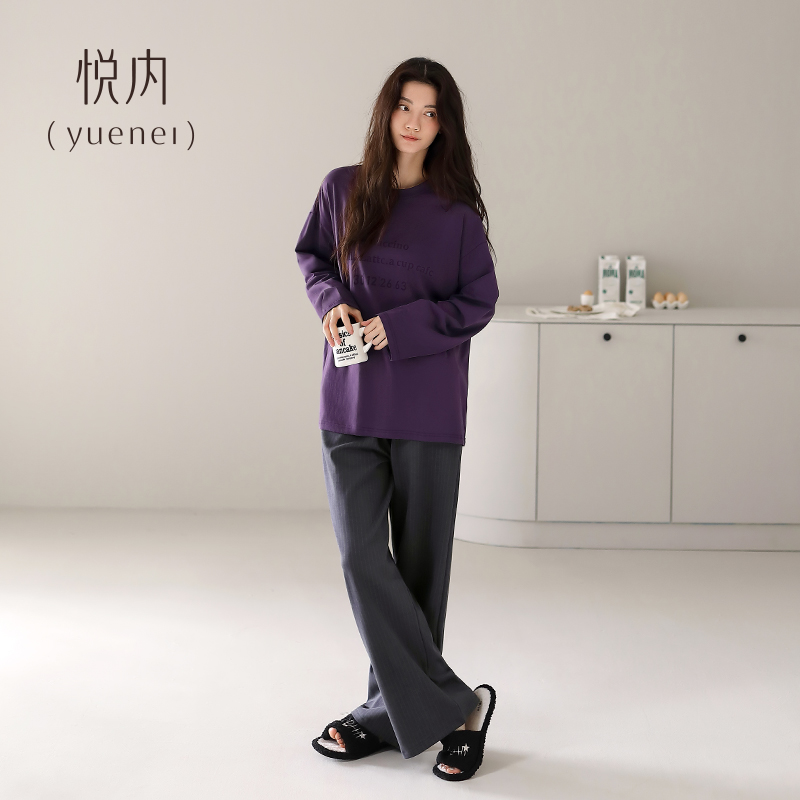 家居服时尚 悦内带胸垫睡衣女款 加大码 纯棉长袖 休闲字母圆领 春秋季