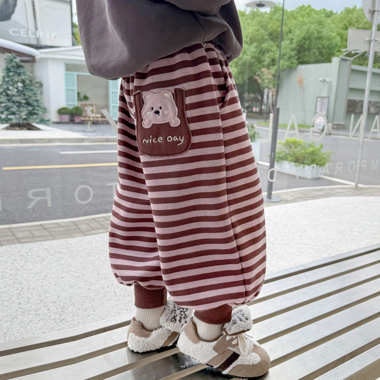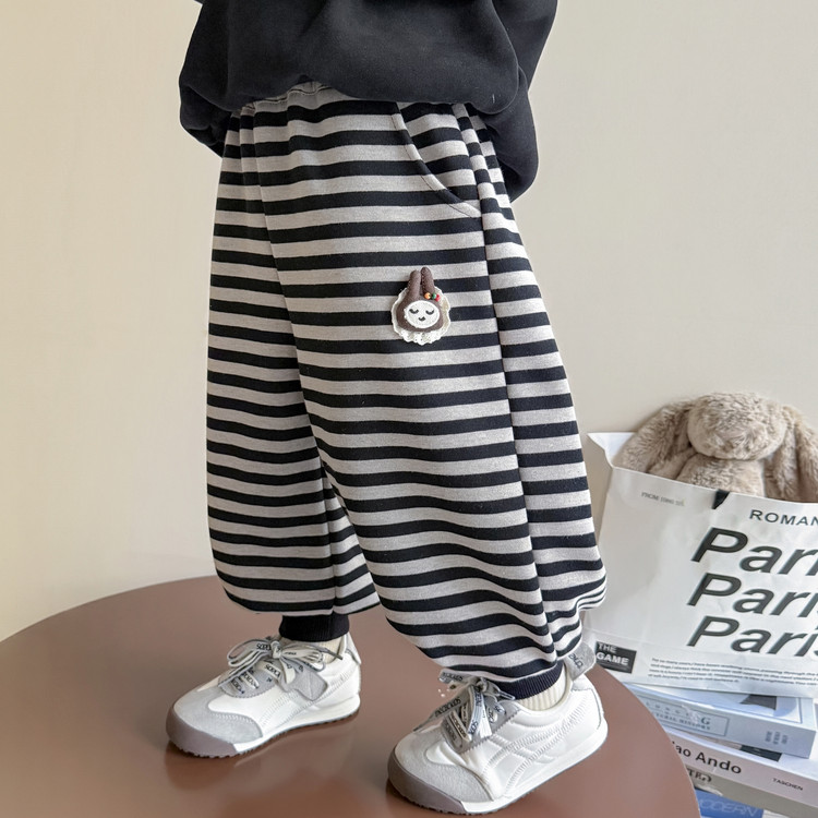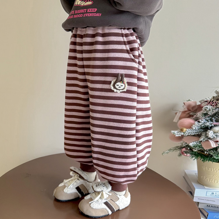 女宝加厚保暖休闲长裤 卡通条纹加绒卫裤 2025秋冬新款 女童加绒长裤