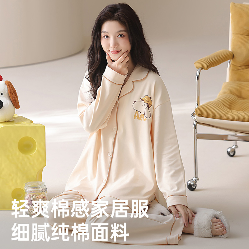 家居服套装 长裤 可外穿舒适女士 纯棉长袖 润微睡衣女100%棉春秋季