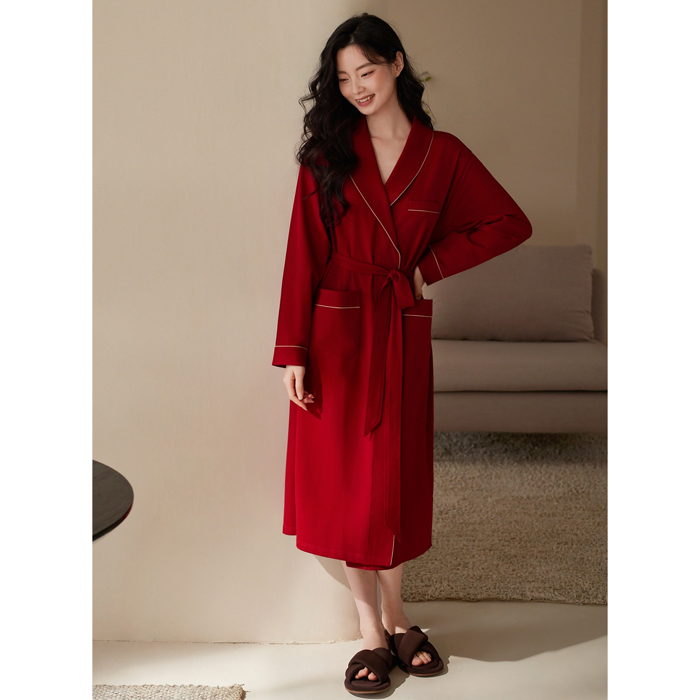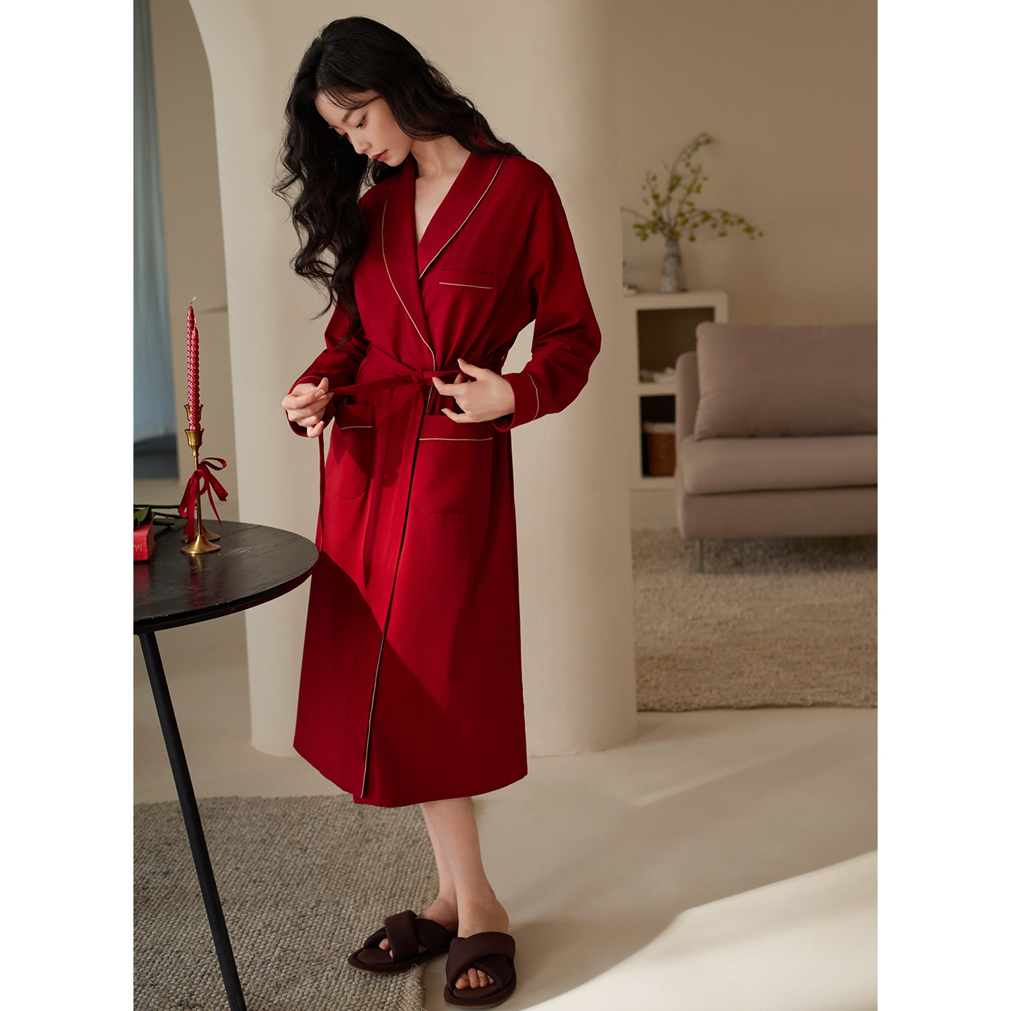 浴衣晨袍 浴袍睡衣红色本命年新婚结婚长款 睡袍女士春秋款 纯棉长袖