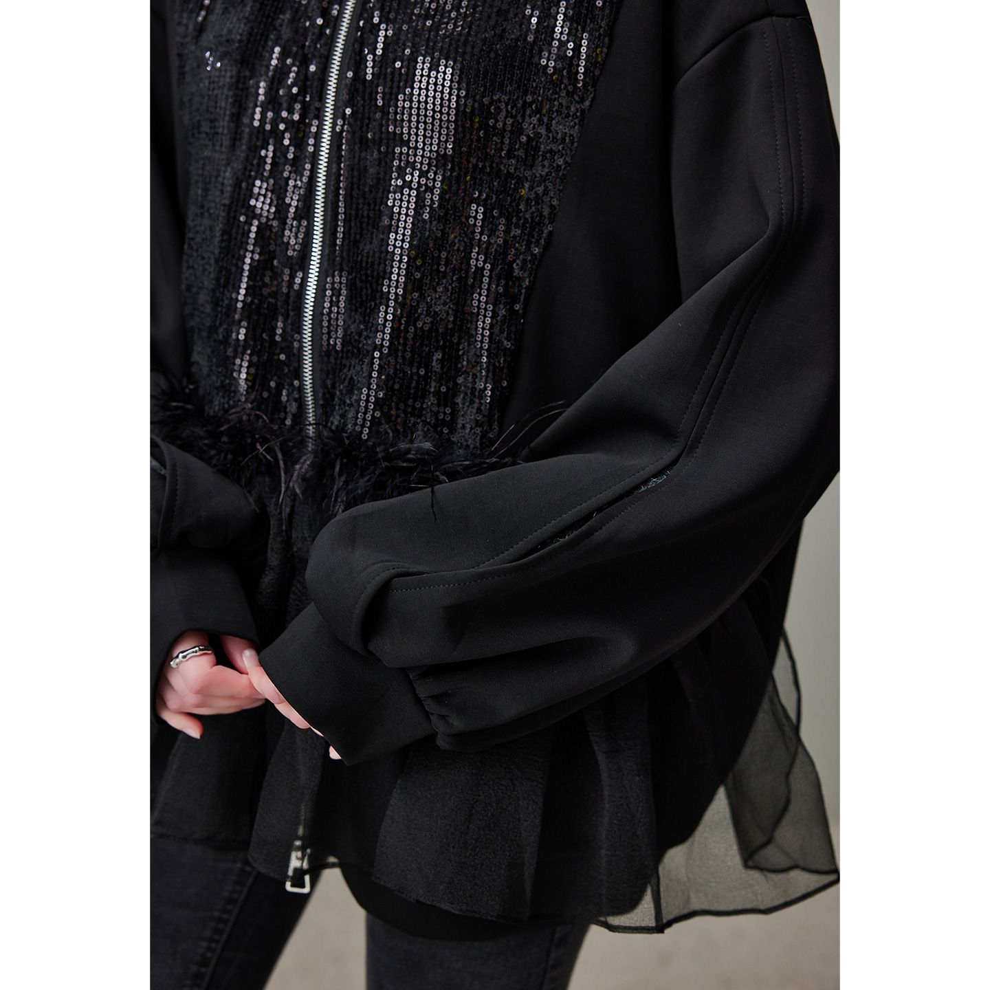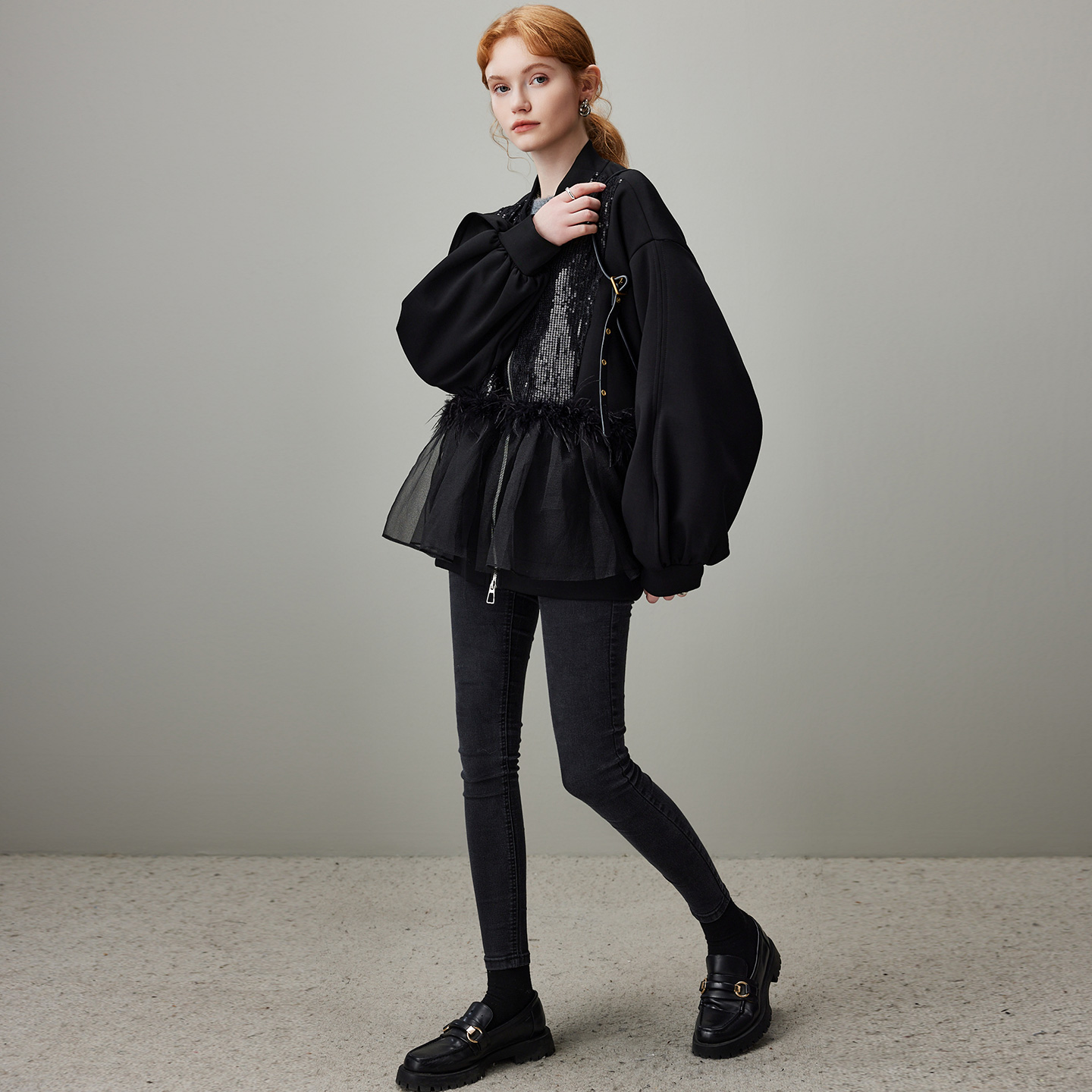 荷叶边亮片宽松夹克上衣 新款 dfvc黑色设计感短款 外套女2025年冬季