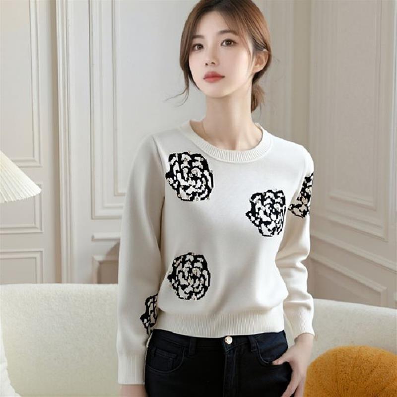 新品 高级感宽松套头针织 韩系温柔软糯提花钉珠圆领毛衣女秋冬新款