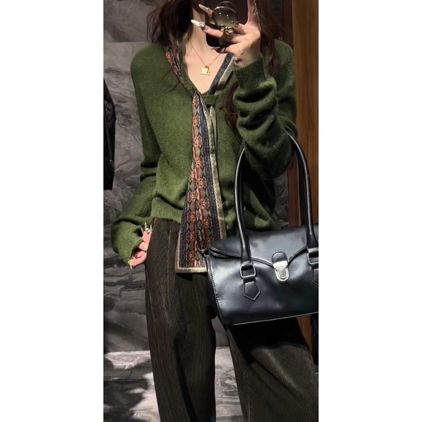 巨好看轻熟风上衣女春秋新款 独特超好看气质绿色针织套头系带毛衣