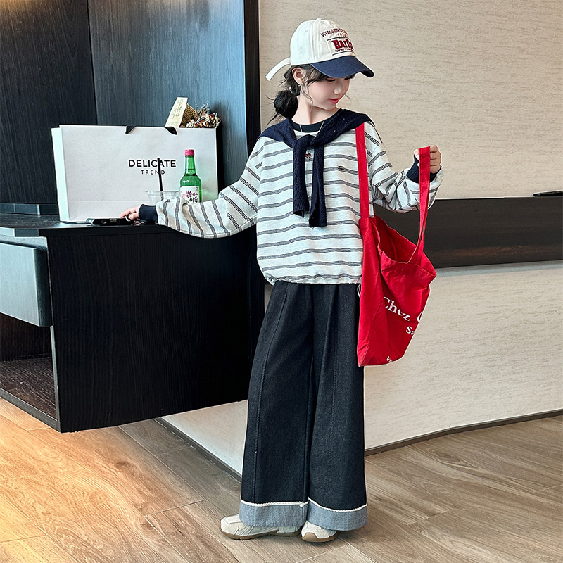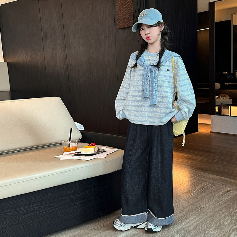 儿童韩系穿搭大童女孩牛仔阔腿裤 2025新款 两件套 卫衣套装 女童秋装