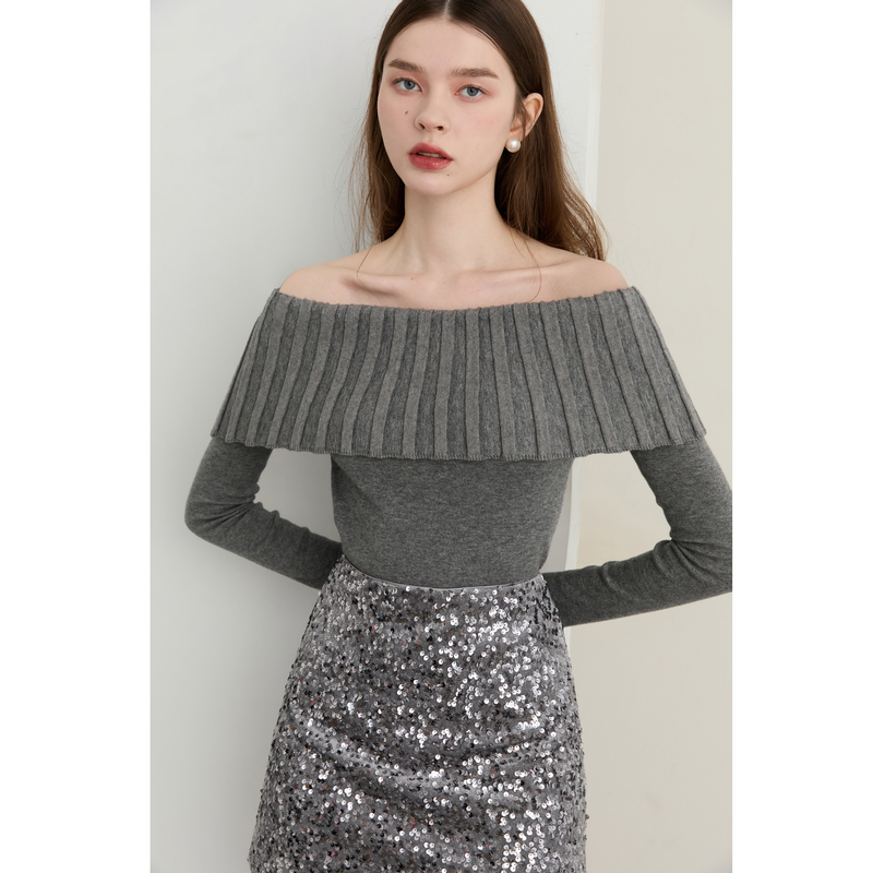 含羊毛打底衫 DPLAY2025年秋季 女露肩一字肩修身 灰色针织衫 新款