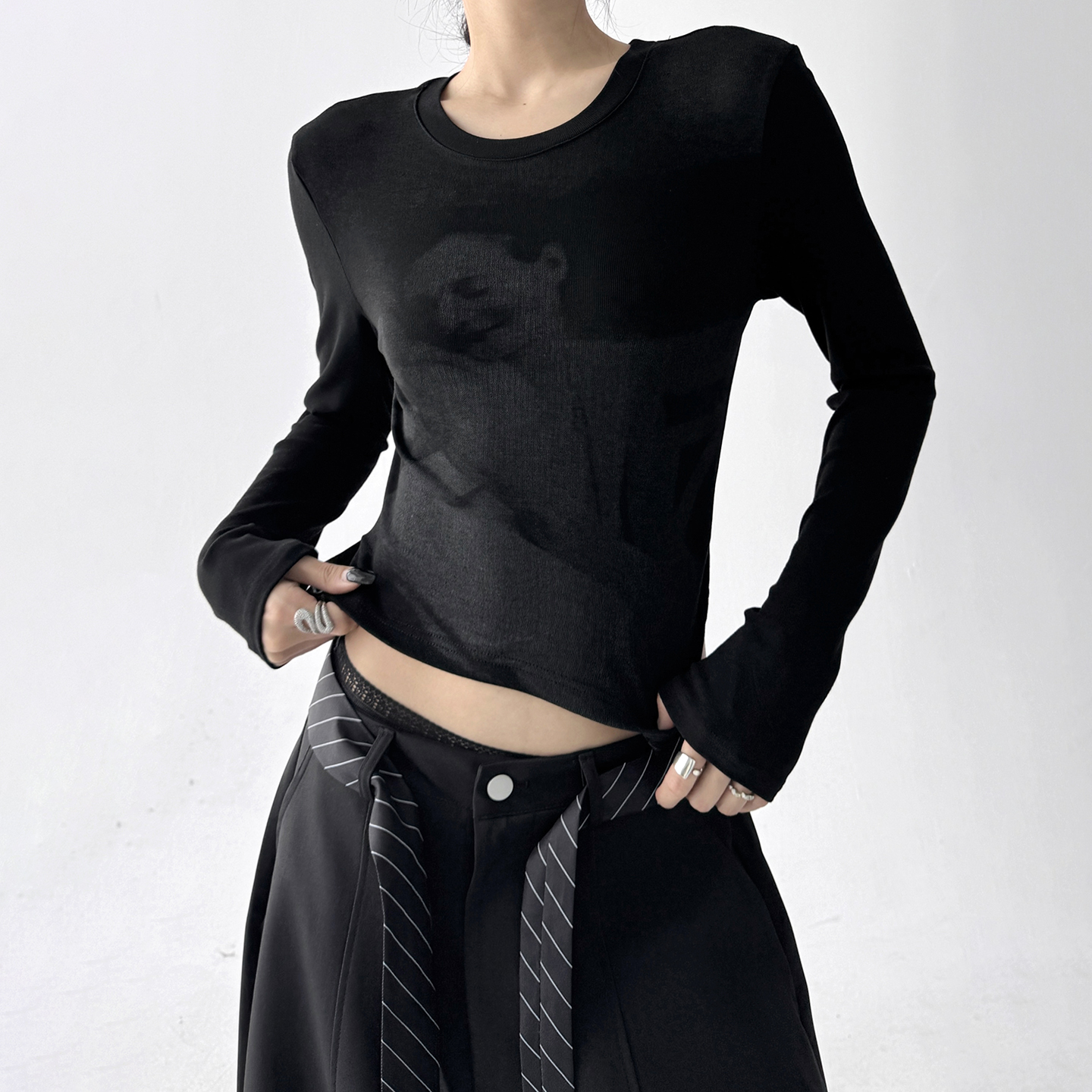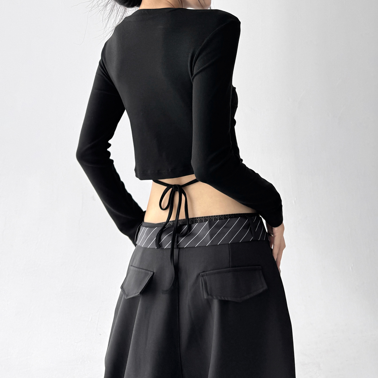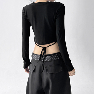 女装 2025新款 修身 正肩内搭打底衫 设计感绑带上衣 长袖 短款 T恤秋季