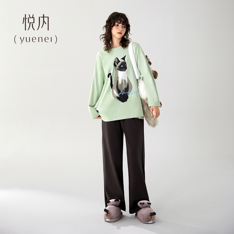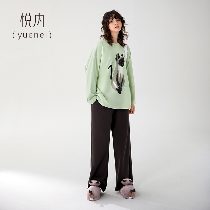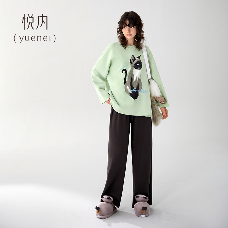 家居服休闲宽松圆领套头猫咪可外穿 纯棉长袖 悦内睡衣女春秋款 秋季