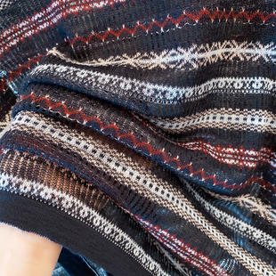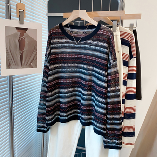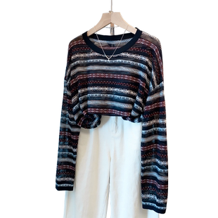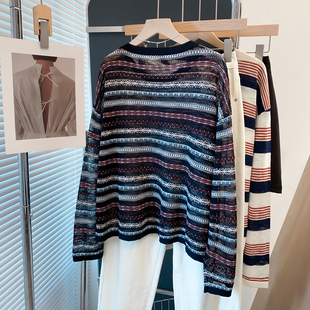 宽松慵懒风上衣薄洋气罩衫 新新款 潮 女2025秋装 镂空圆领条纹针织衫