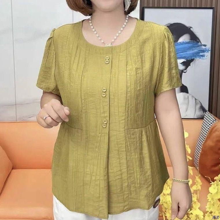 中老年女装 圆领短袖 冰丝麻衬衫 宽松妈妈装 薄上衣 大码 抖音2025新款