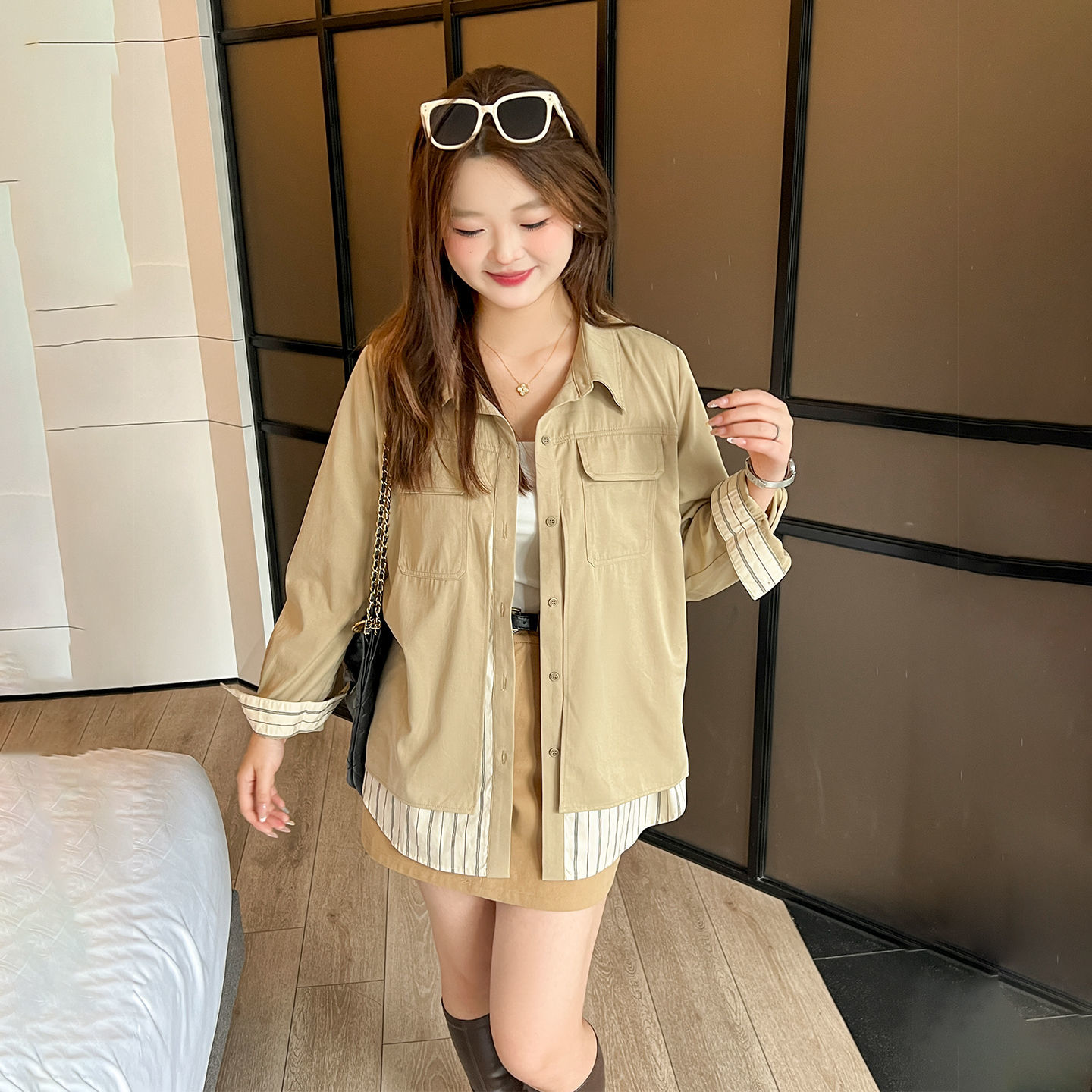 菱形格V领短背心易打理衬衣俏皮学院风两件套 女冬季 森马长袖 衬衫