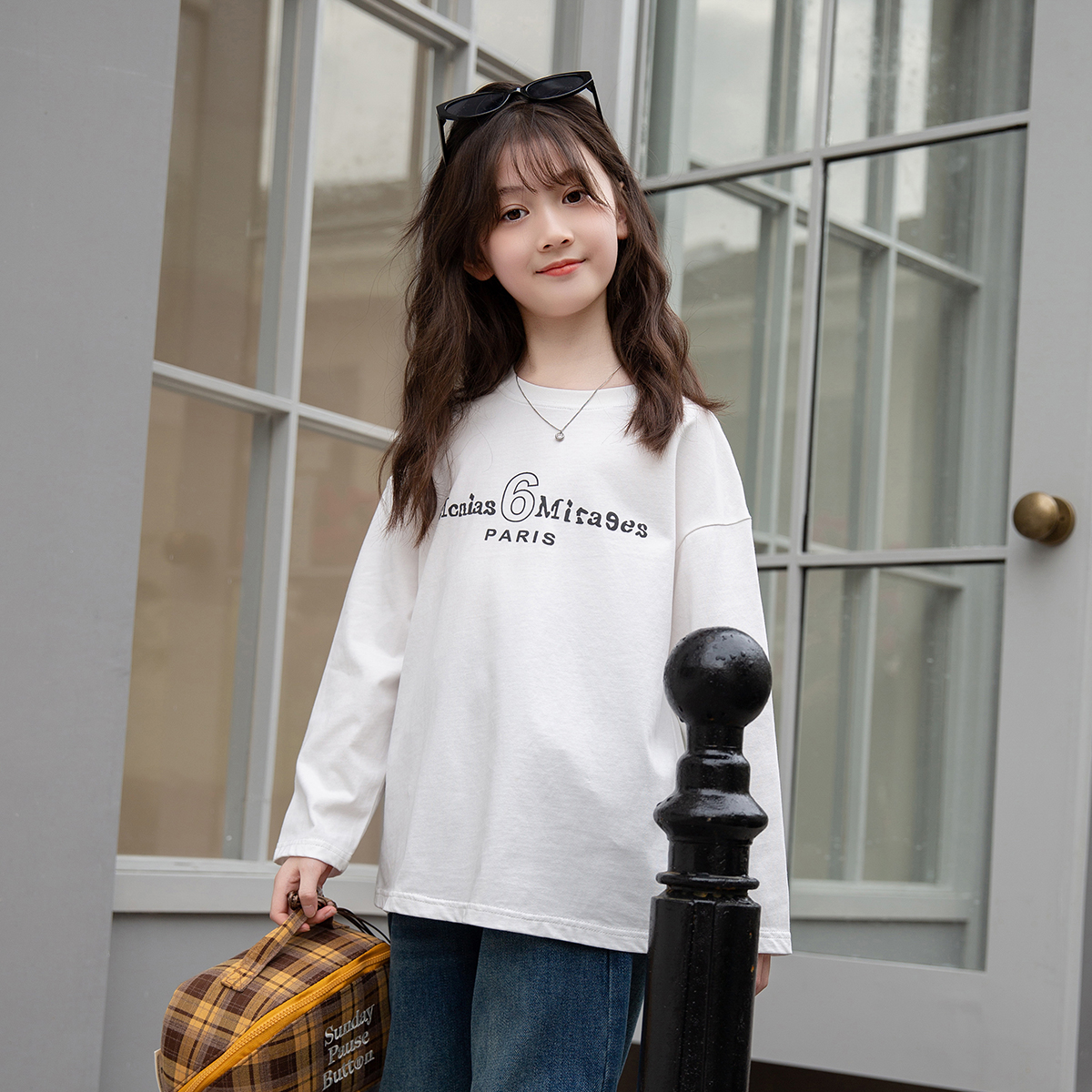 宽松洋气时髦纯棉儿童上衣 圆领字母韩版 女童长袖 T恤2025春秋新款