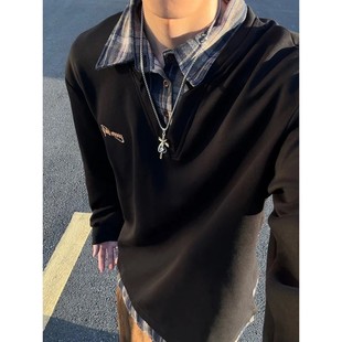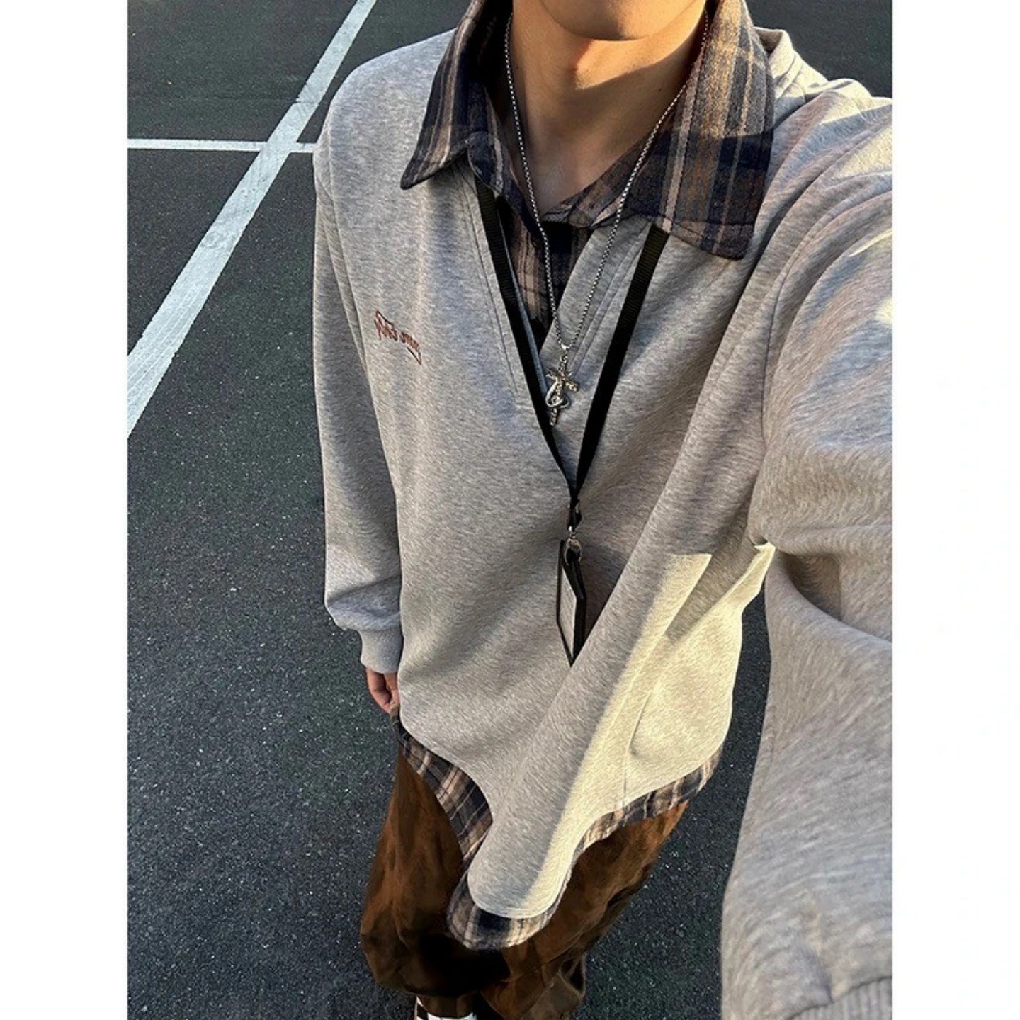 t恤学院风内搭polo衫 慵懒格子长袖 领卫衣男秋季 浅灰色假两件衬衫