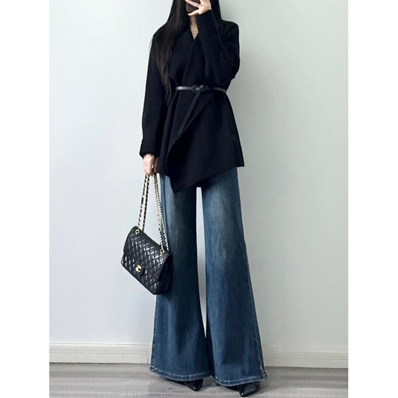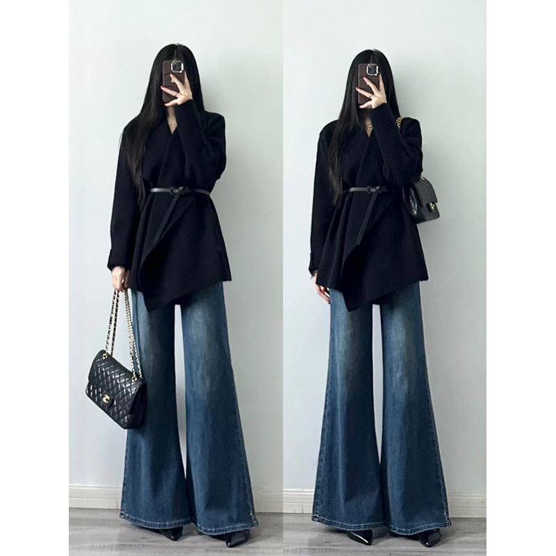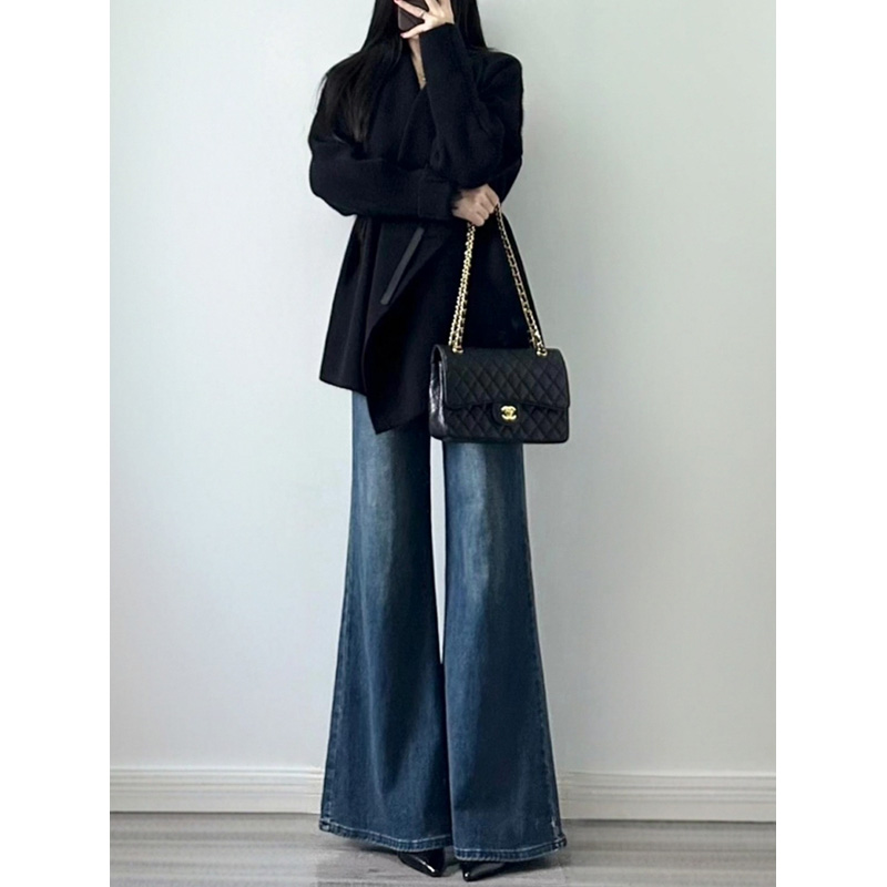 more阔腿牛仔裤 深蓝色复古弯刀裤 女2025新款 流行风格 子X 秋季 one