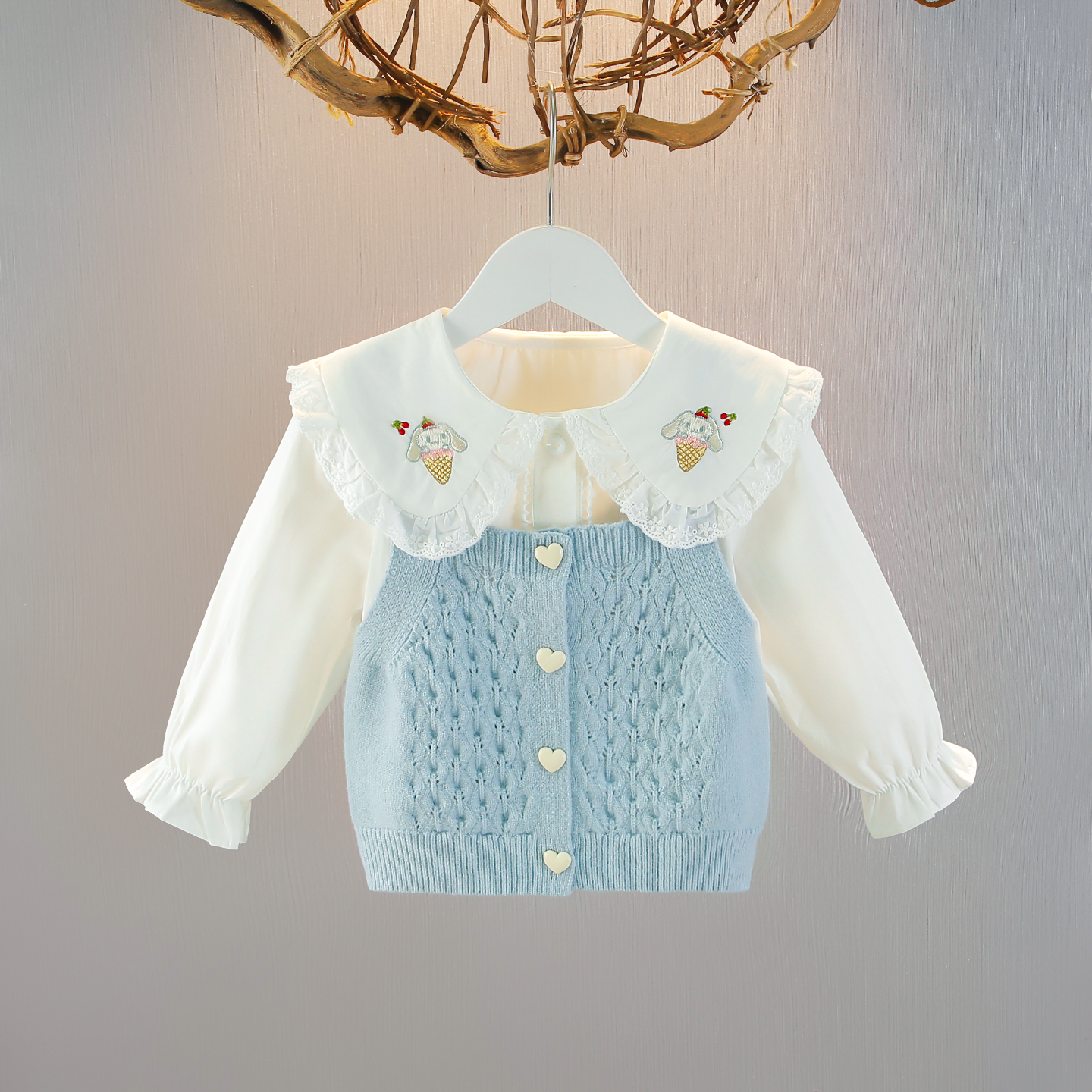 套装 叠穿内搭T恤木耳边牛仔阔腿裤 新款 蓝色镂空针织背心裙女秋季