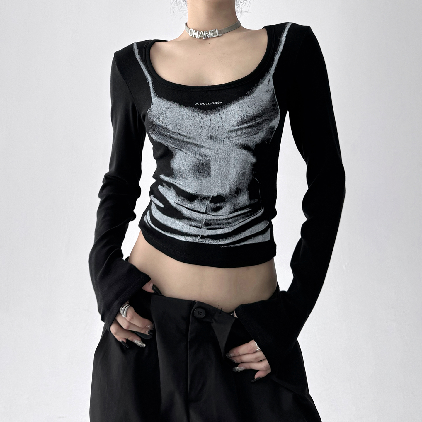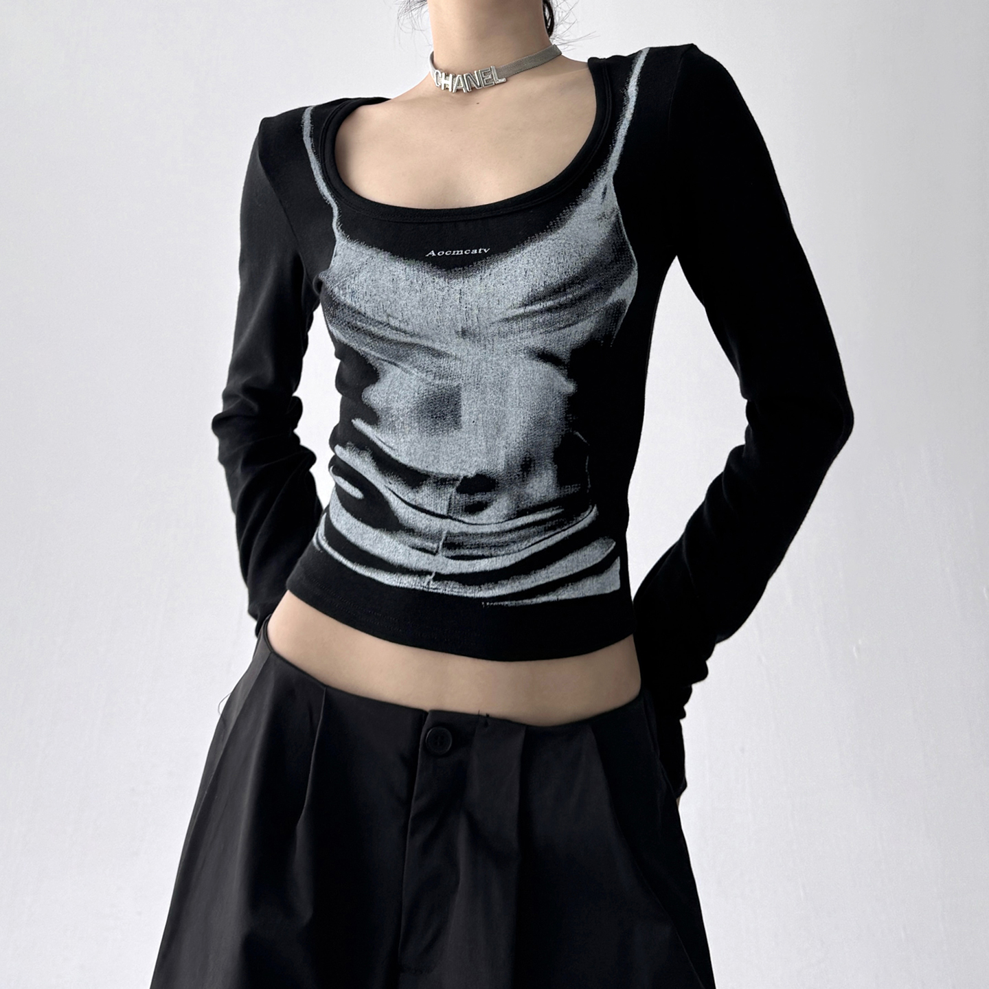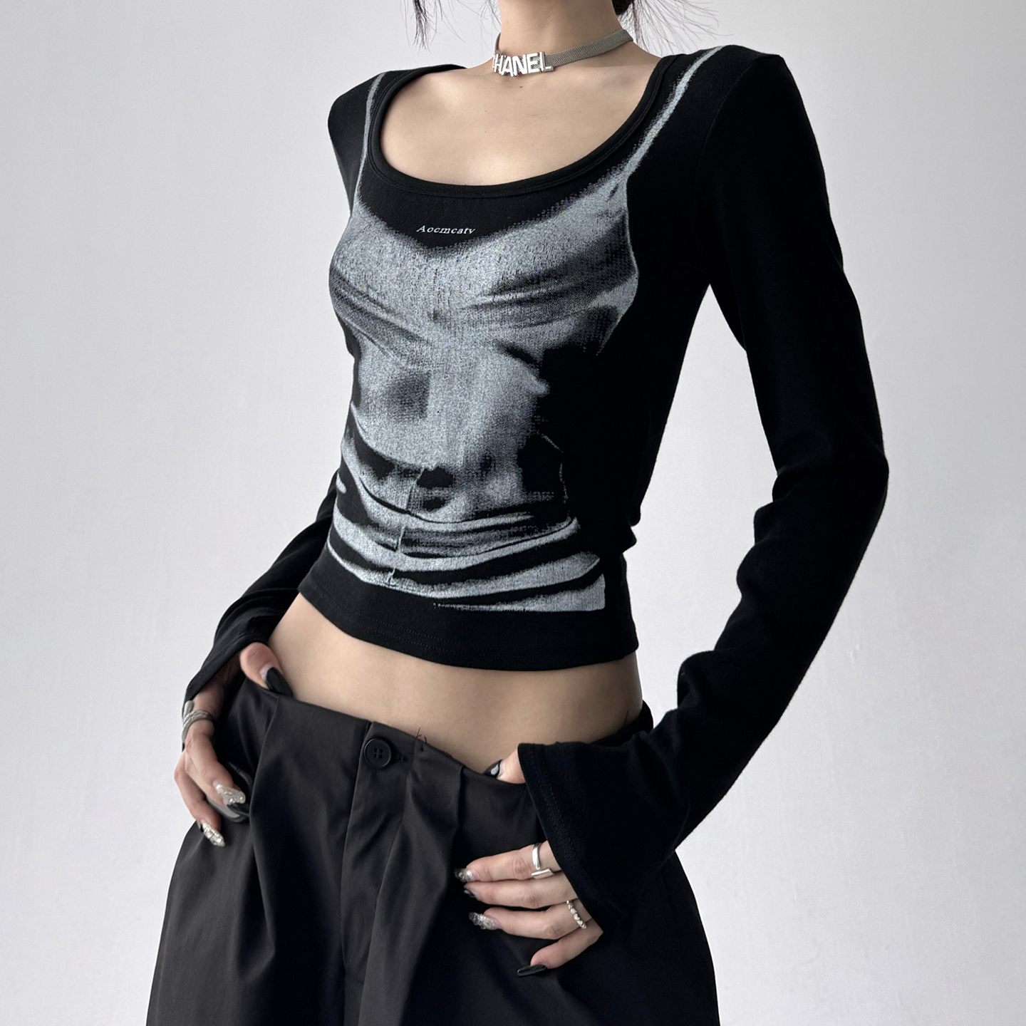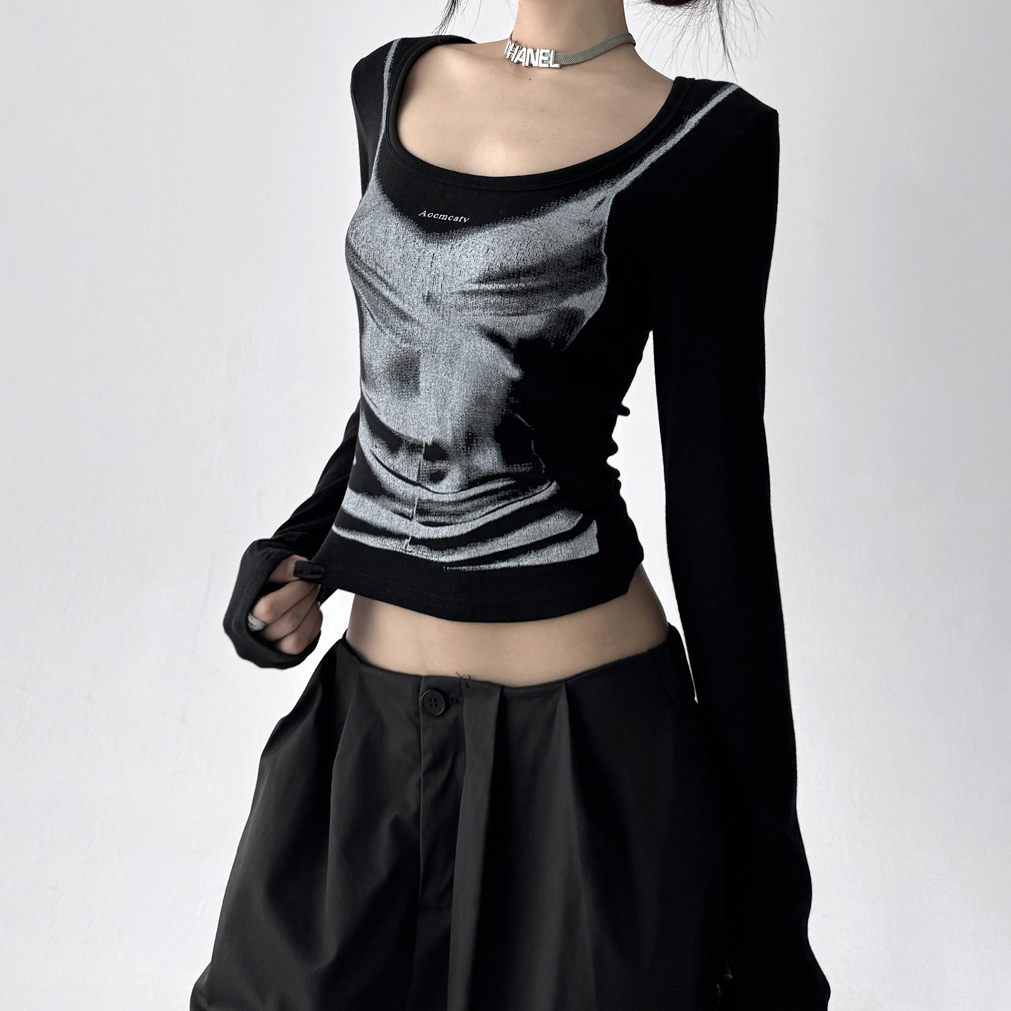 显瘦百搭高级感打底衫 黑色印花长袖 修身 新款 上衣 T恤女2025春秋季
