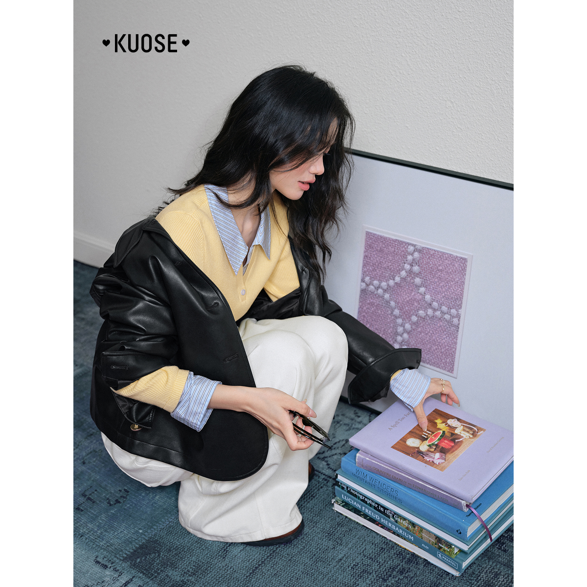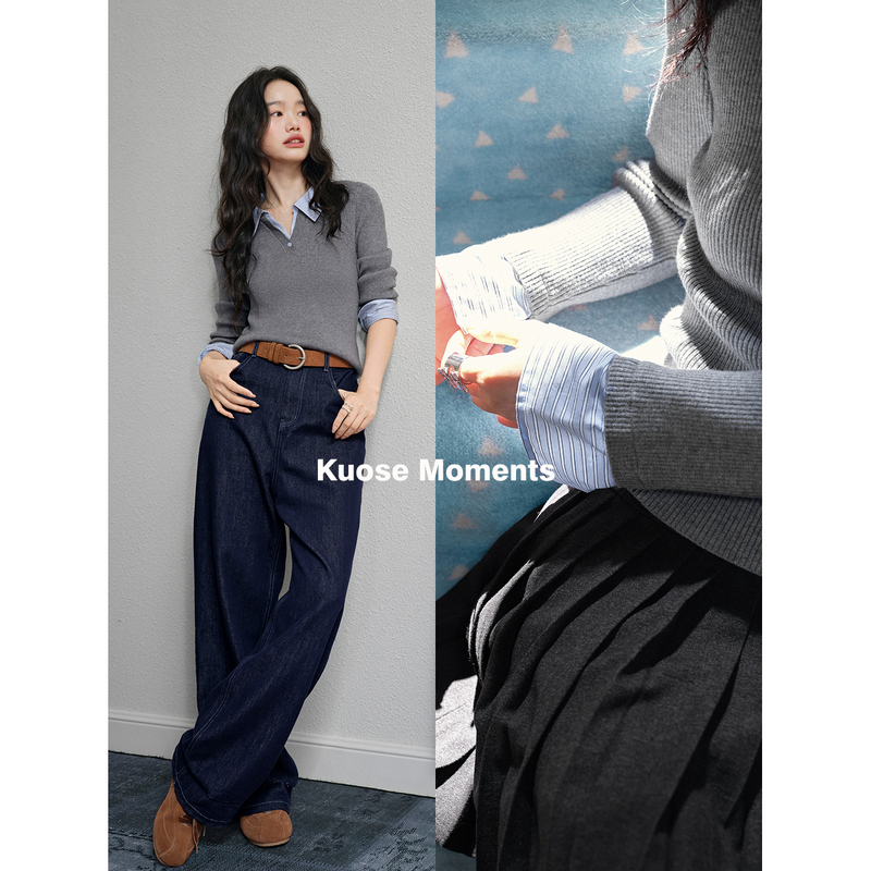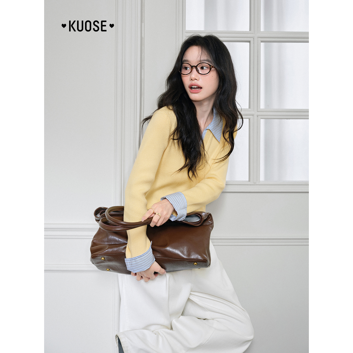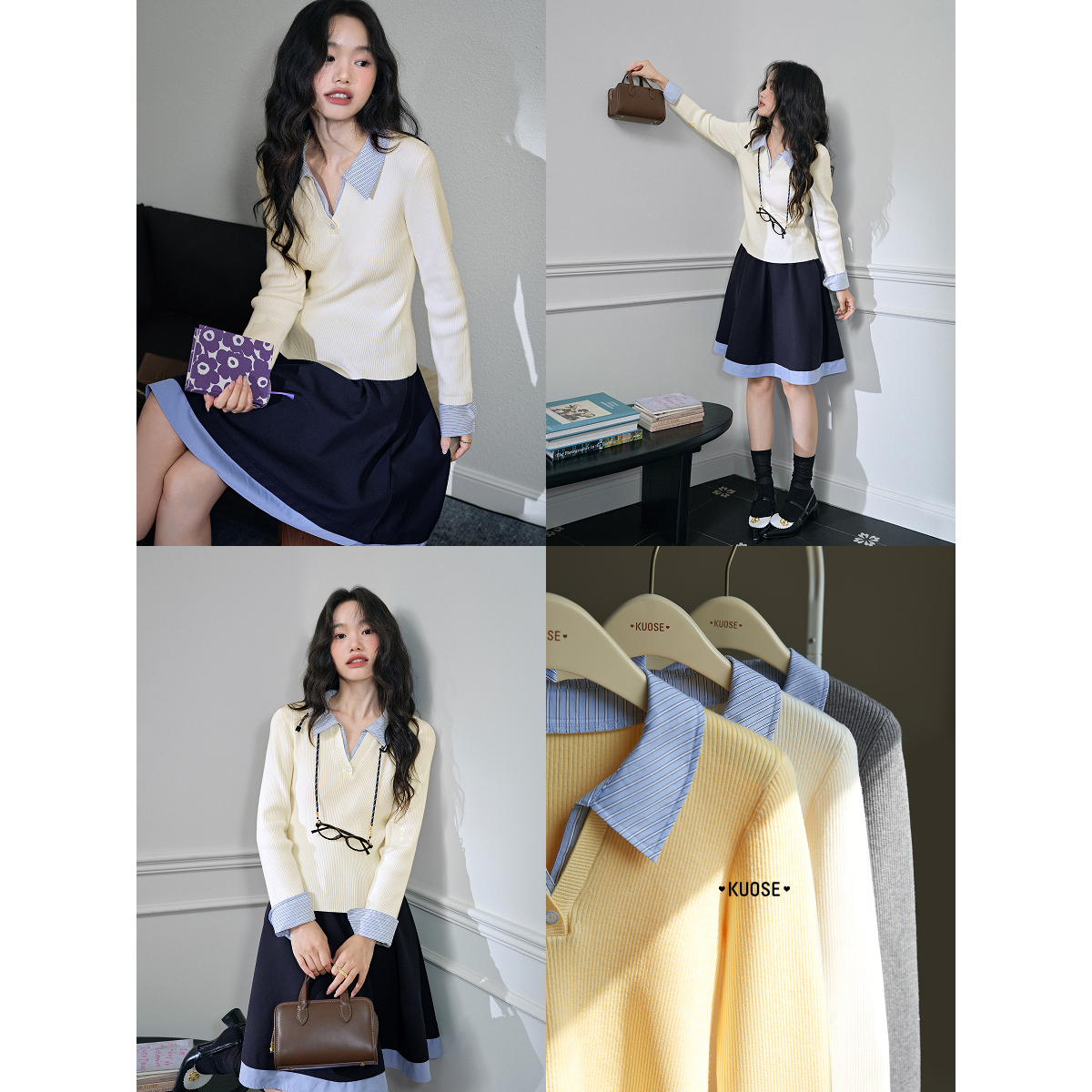 显瘦针织衫 黄色修身 新款 阔色条纹假两件polo领上衣灰色女2025秋季