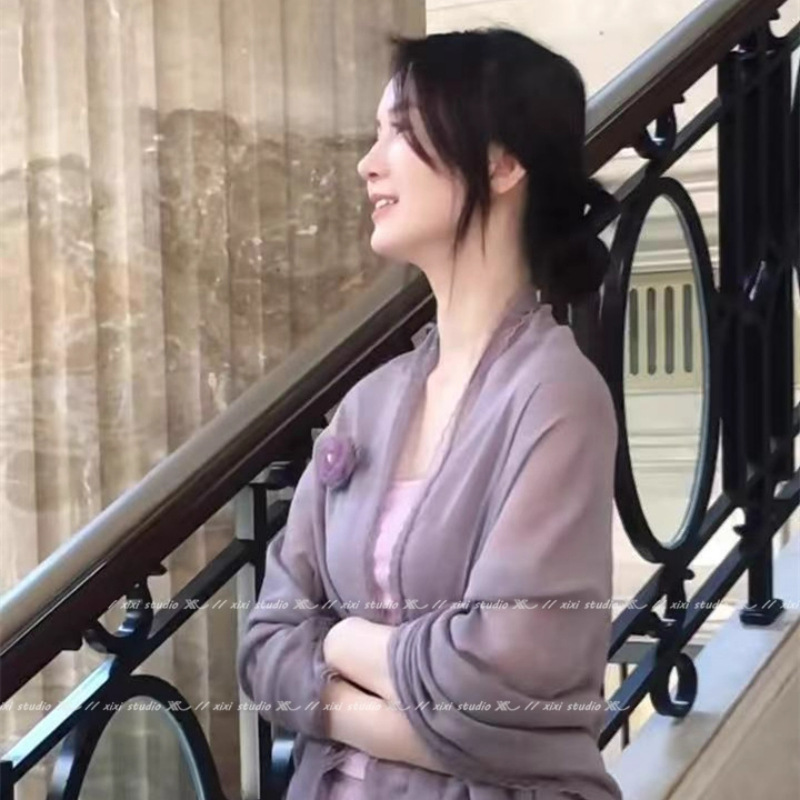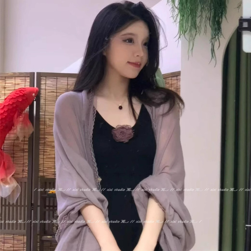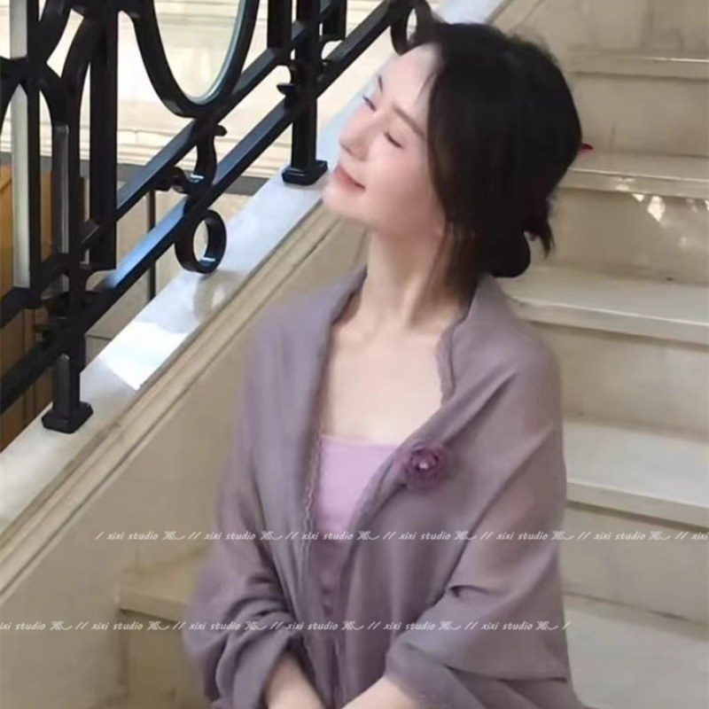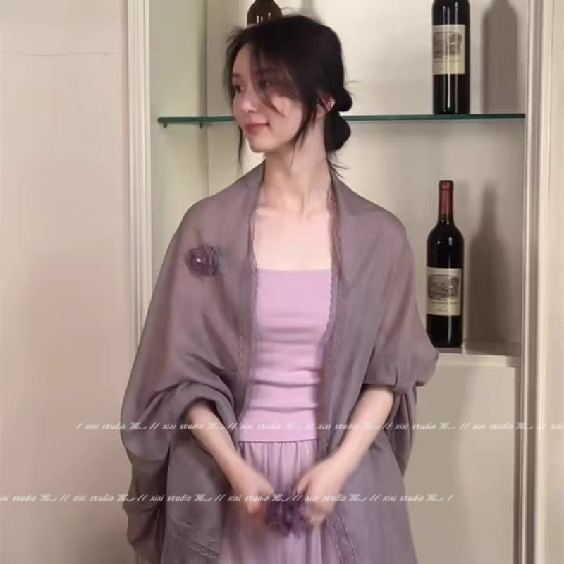 办公室披风 高端新品 法式 紫色披肩蕾丝配吊带外搭棉麻夏空调房开衫