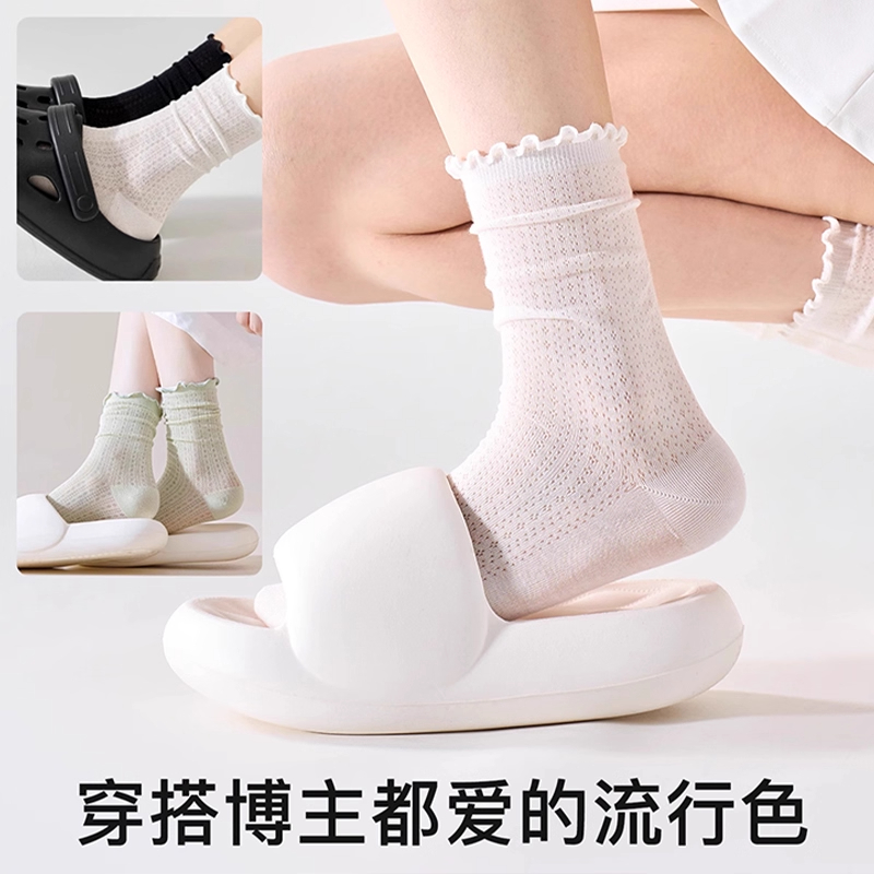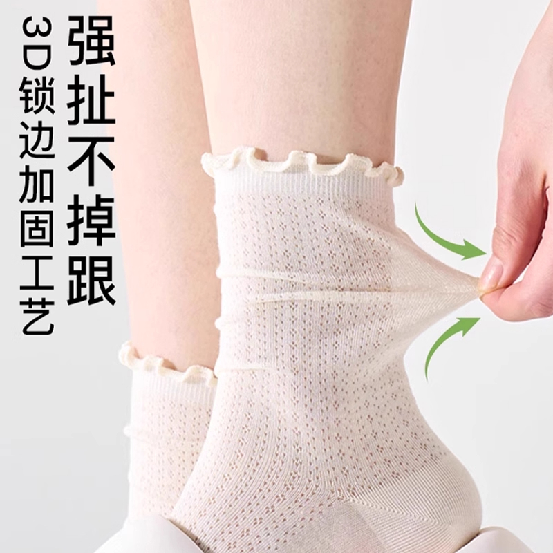 袜子女士夏季 桑蚕丝凉感网眼透气中筒棉袜白色夏天堆堆袜可爱薄款