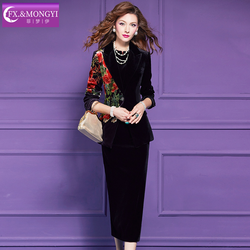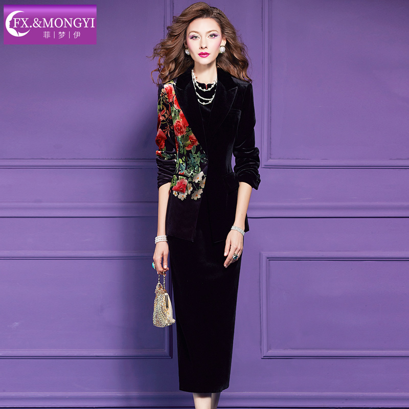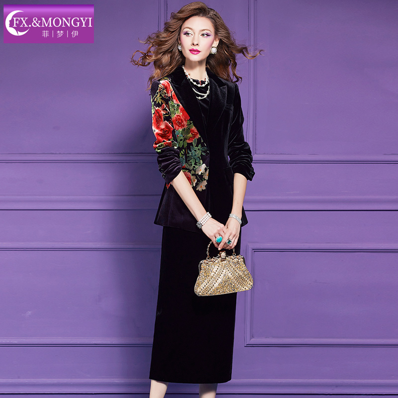 复古高级感气质印花西服裙子 女秋季 菲梦伊原创黑色金丝绒西装 套装