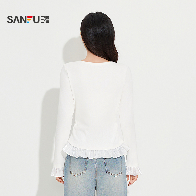 上衣504758 休闲打底内搭长袖 三福女秋季 微宽松收褶纽扣花边单衣