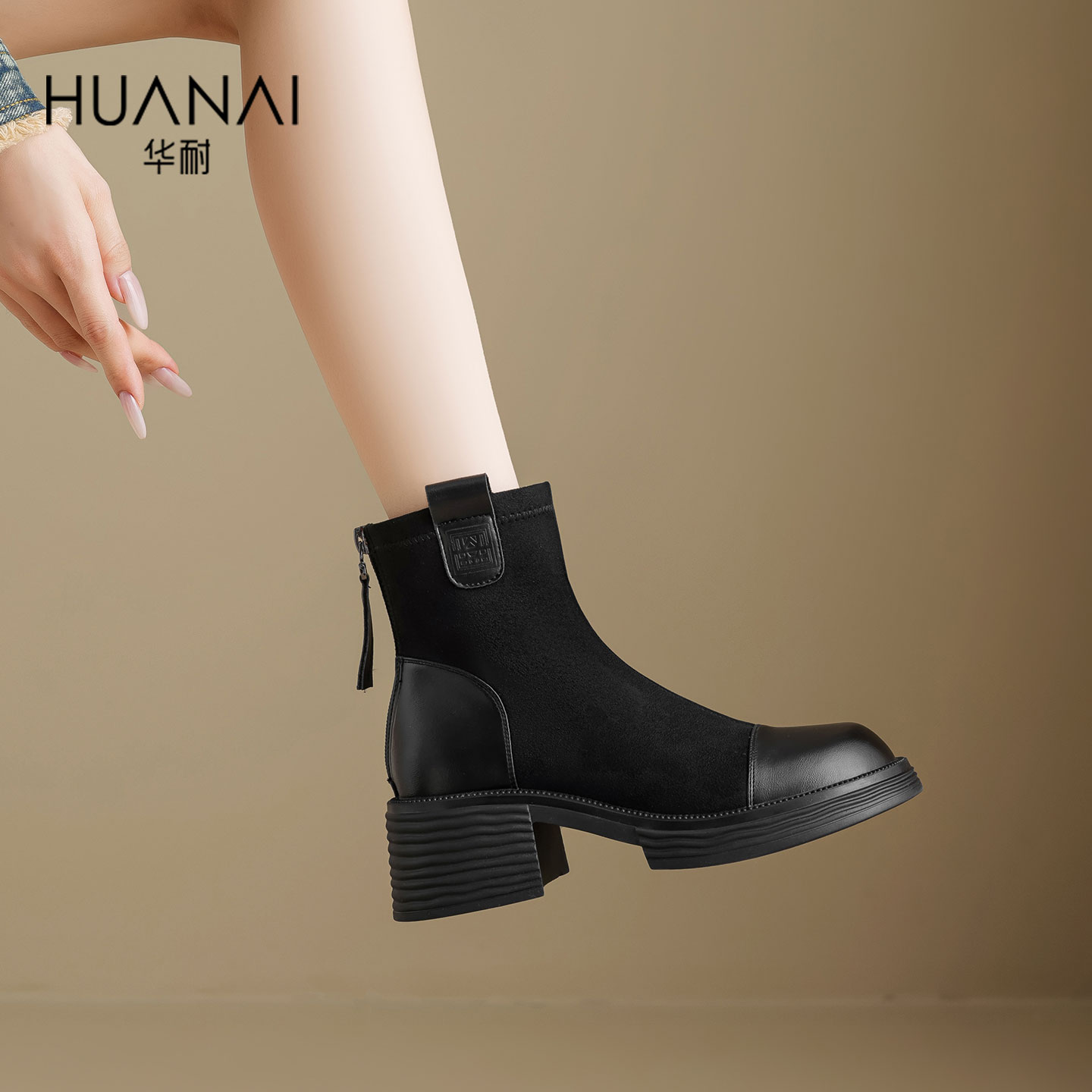 华耐加绒粗跟短靴2025秋冬新款 靴 靴子女英伦风马丁靴增高显瘦时装