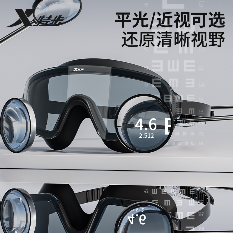 特步泳镜男款 漂流专用游泳眼镜 高清防水防雾大框电镀成人泳帽套装
