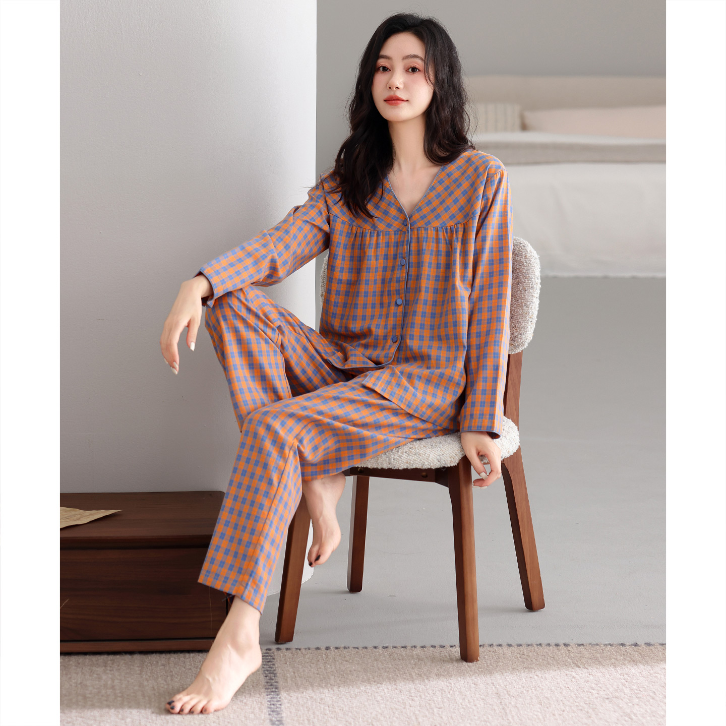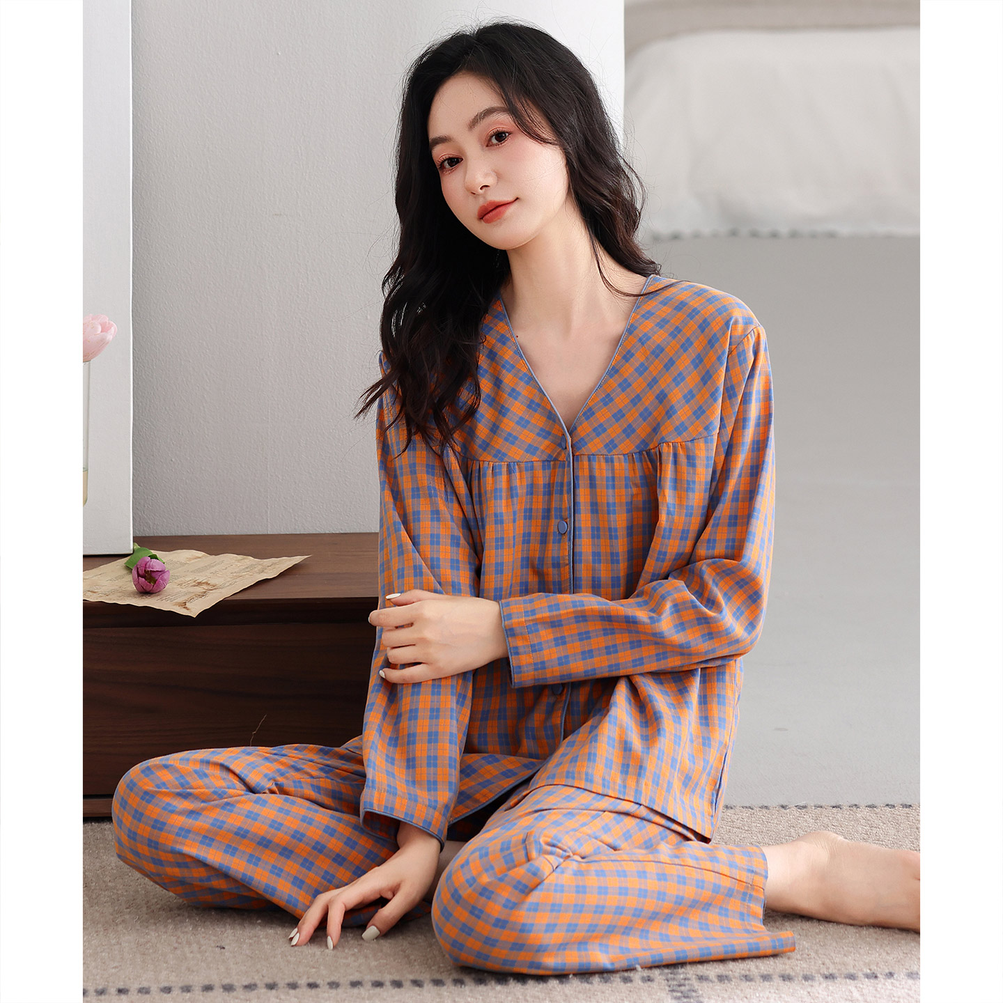 全棉纱布中年妈妈夏季 秋季 家居服 梭织纯棉长袖 带胸垫睡衣女春秋款