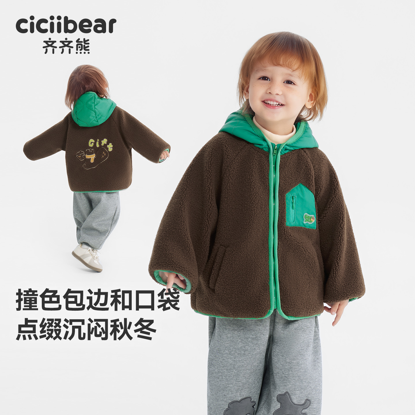 齐齐熊宝宝羊羔绒外套男童秋冬2025新款 儿童连帽加厚加绒保暖上衣