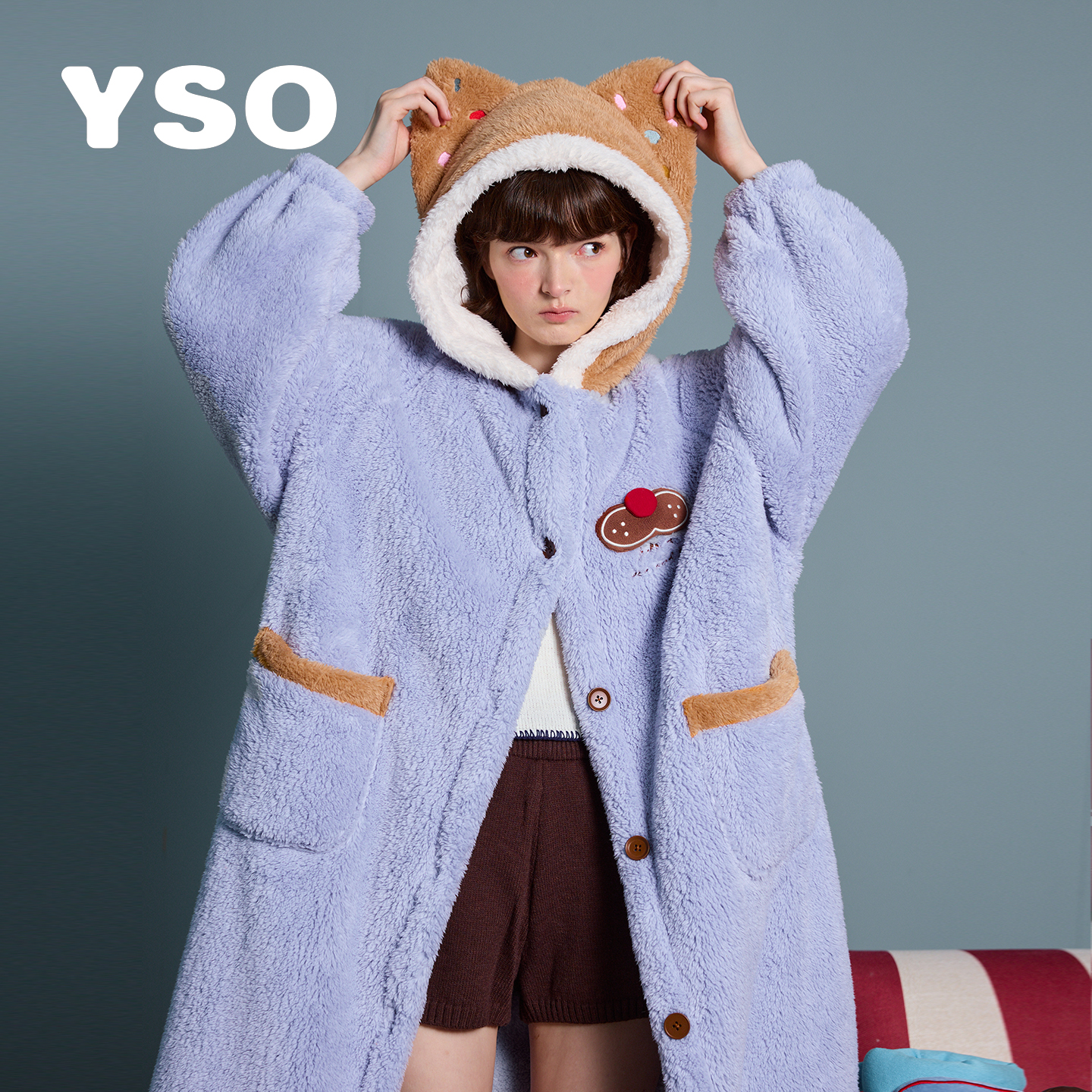 连帽加厚保暖开衫 yso 毛绒长款 睡衣女秋冬新款 睡袍D 酷猫系列