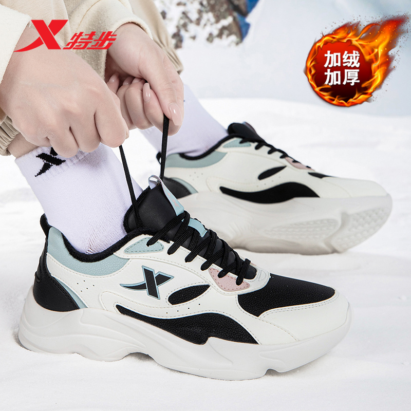 女2025新款 小白鞋 秋季 跑步软底皮面运动鞋 加绒保暖棉鞋 特步老爹鞋