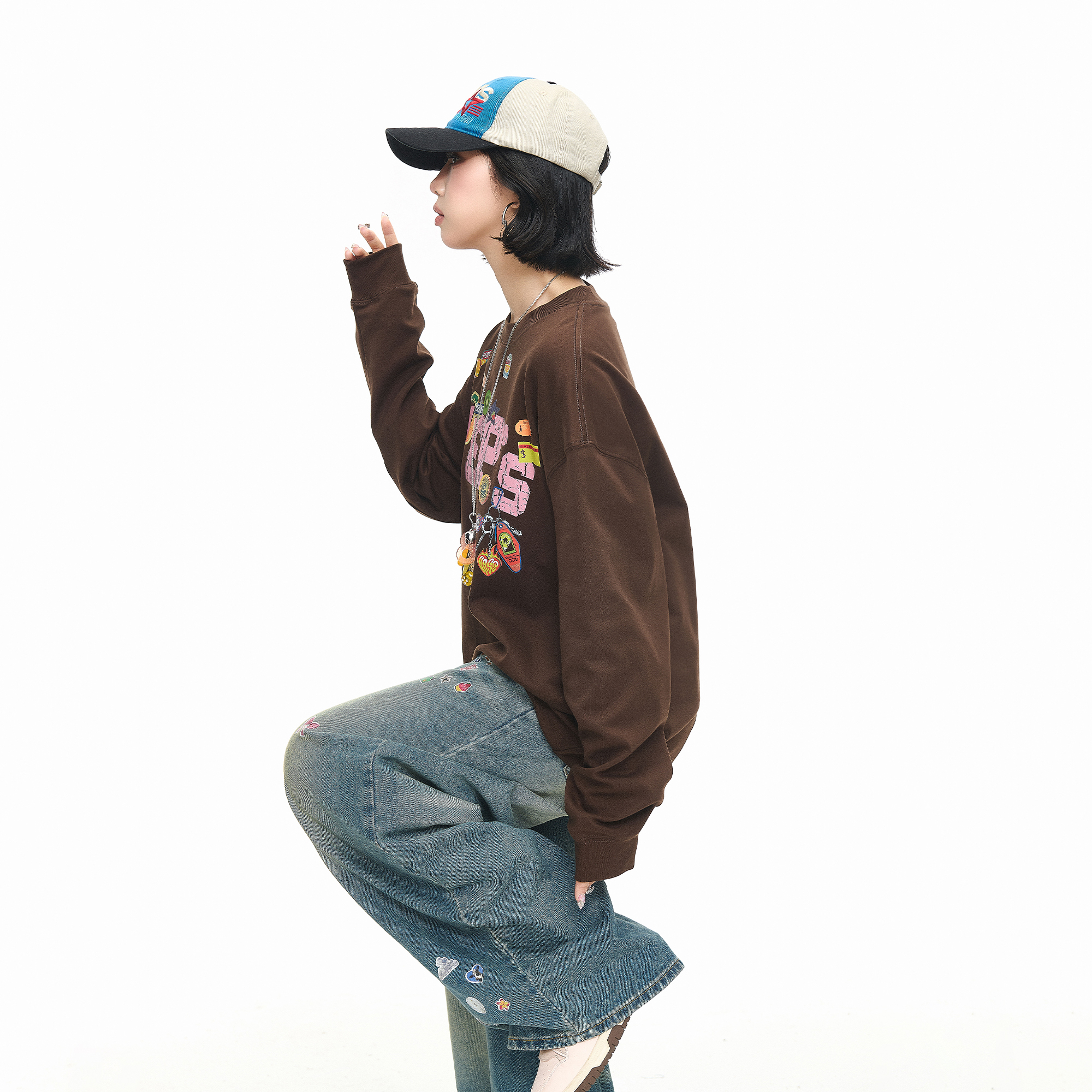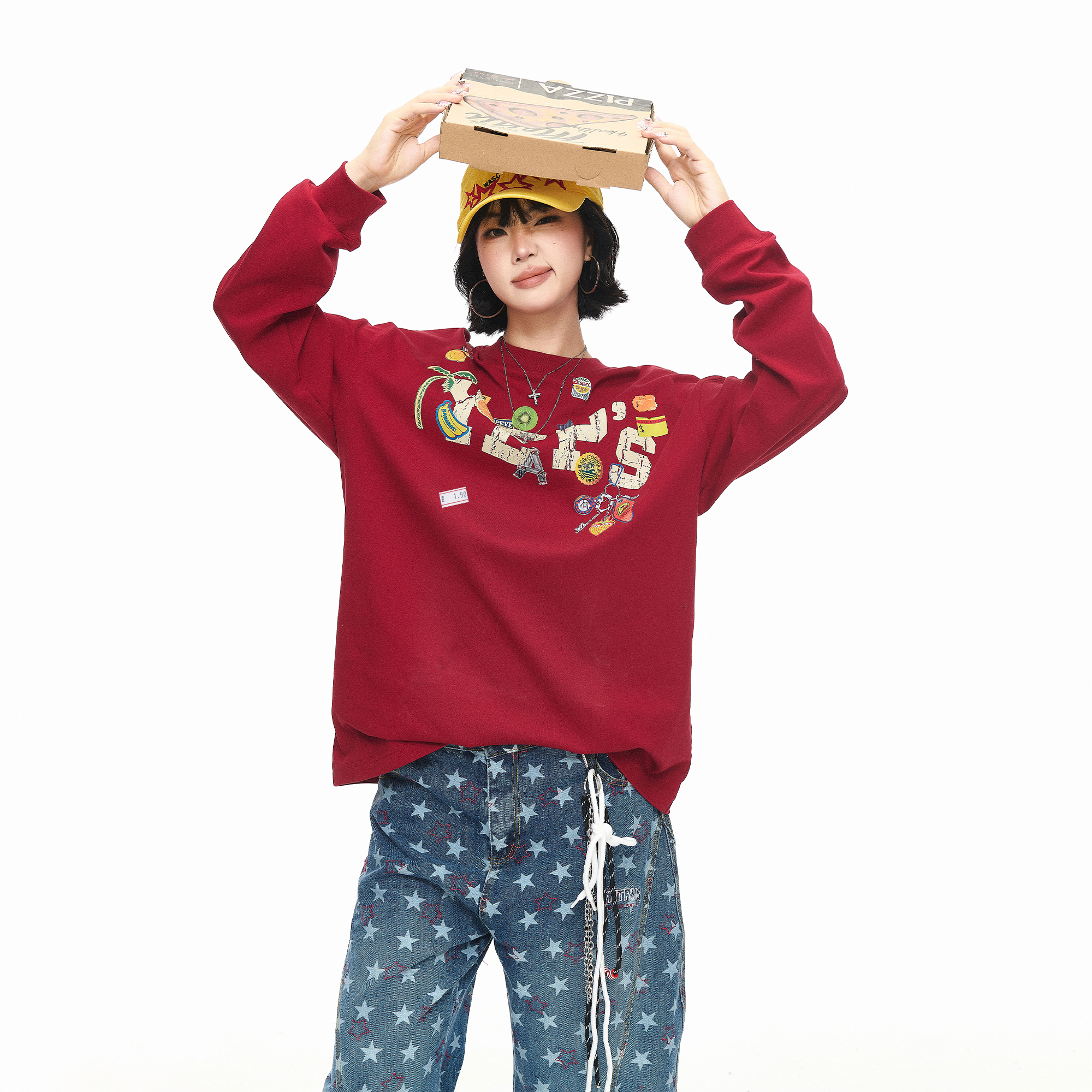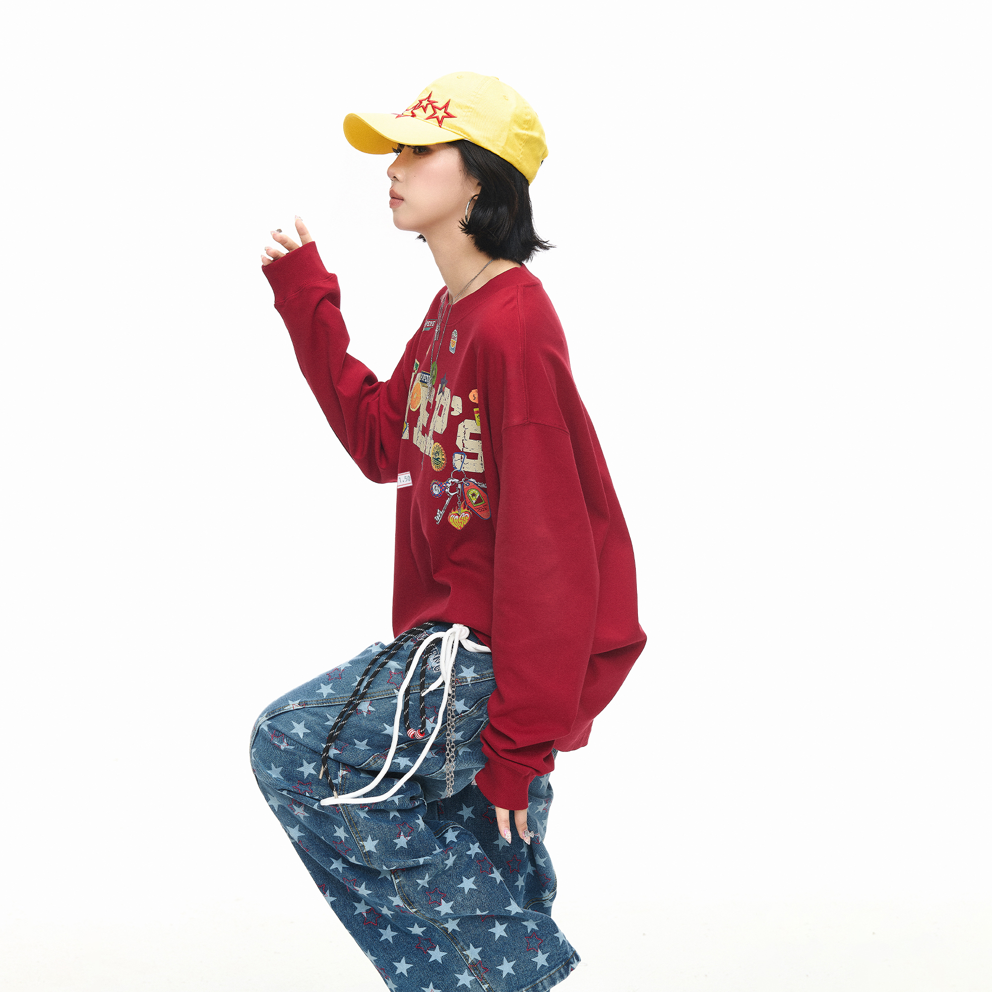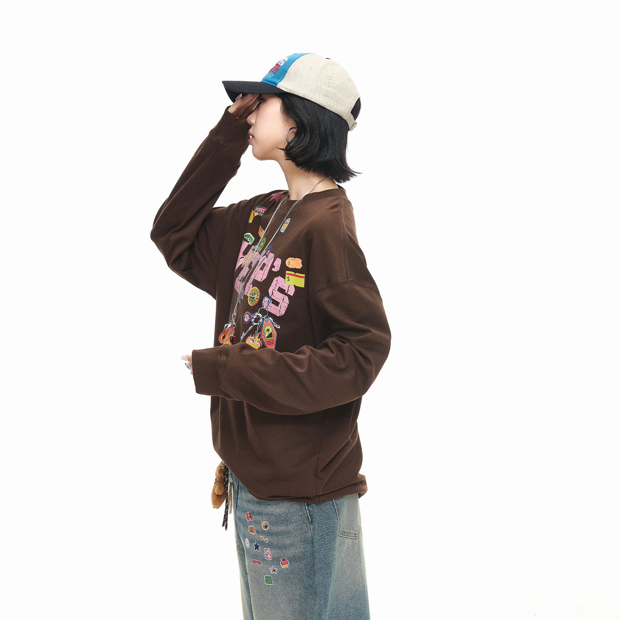 慵懒松弛感宽松罩衫 T恤女2025春秋新款 套头上衣 复古印花长袖 美式