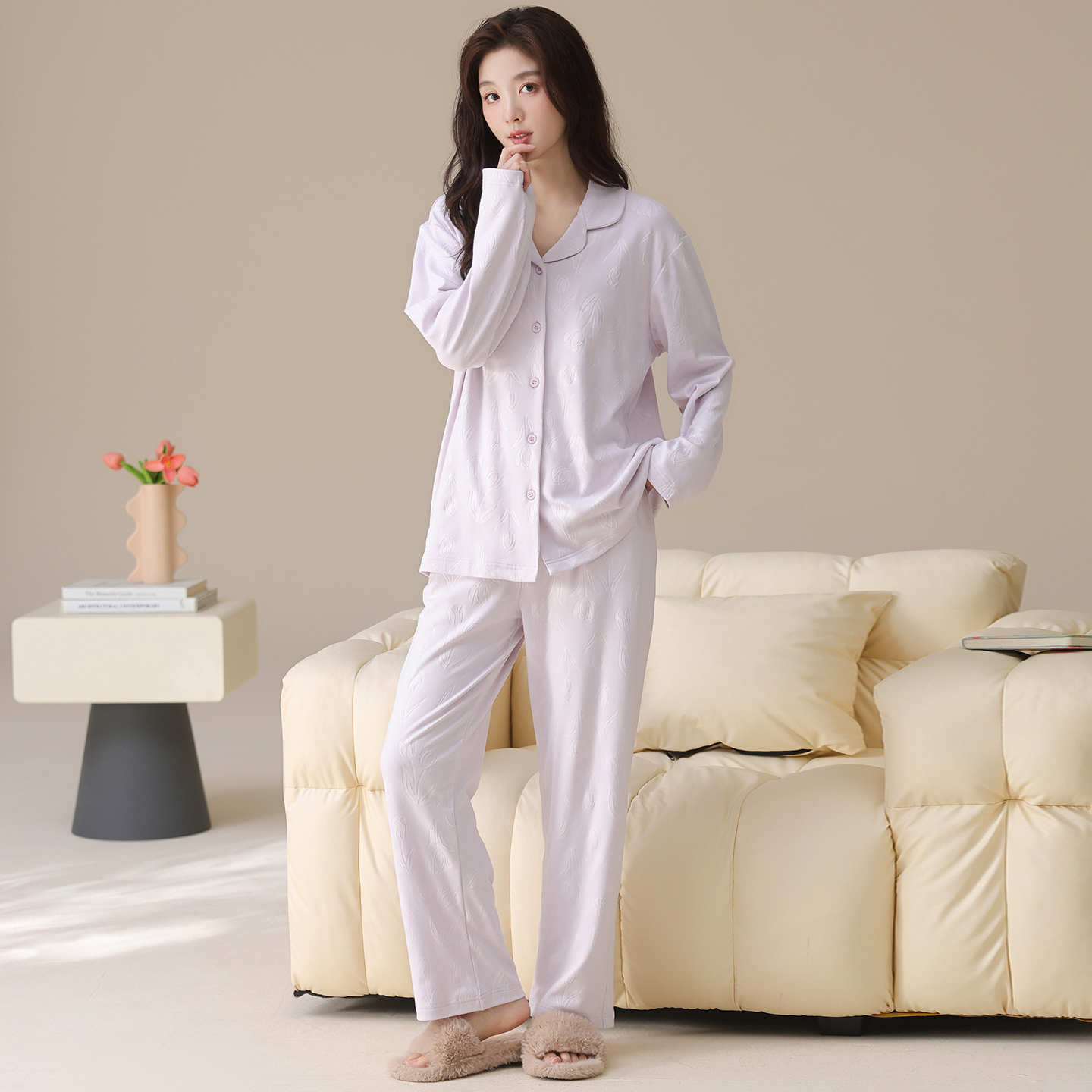 长袖 全棉大码 套装 女款 家居服 简约休闲秋季 芬腾春秋睡衣女纯棉开衫