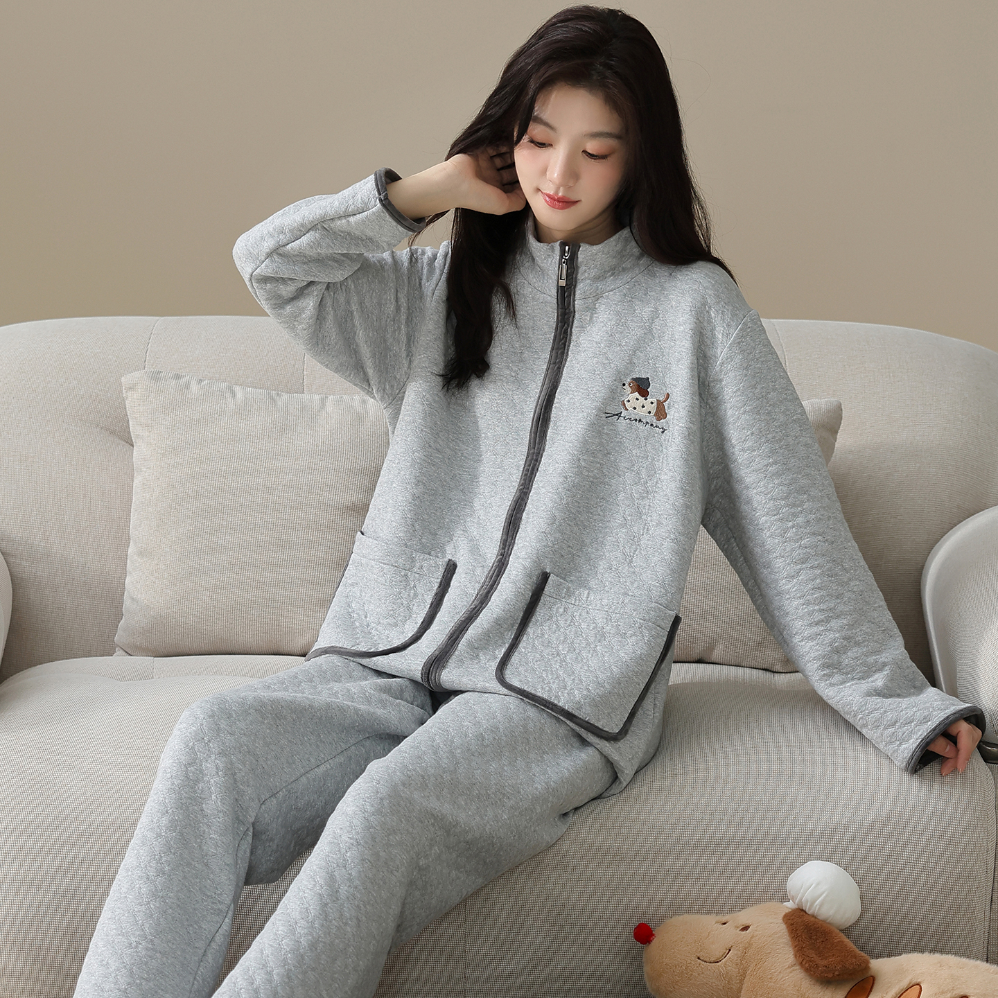 薄款 圆人睡衣女士春秋款 冬季 家居服秋冬款 夹棉空气棉 纯棉夹层长袖