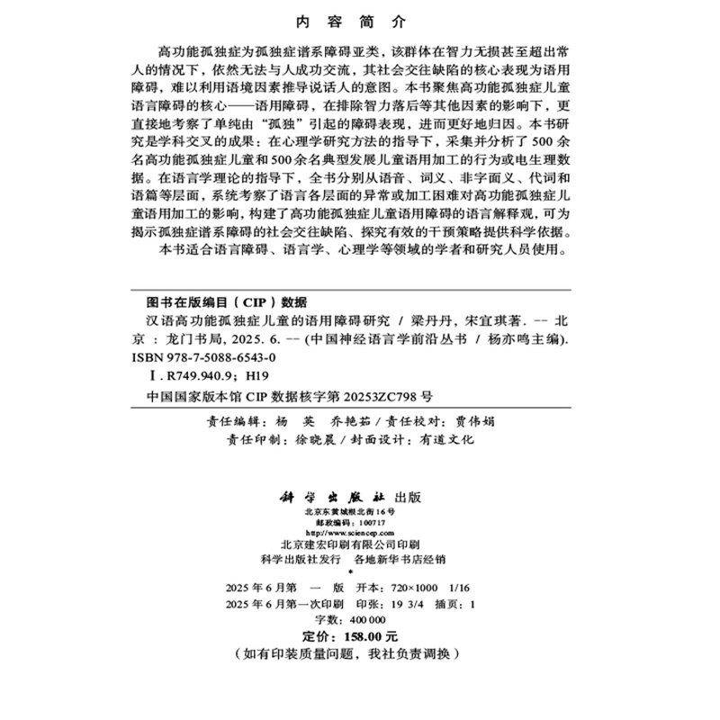 杨亦鸣 社9787508865430 语用障碍研究 科学出版 中国神经语言学前沿丛书 编 著 宋宜琪 梁丹丹 汉语高功能孤独症儿童 现货速发