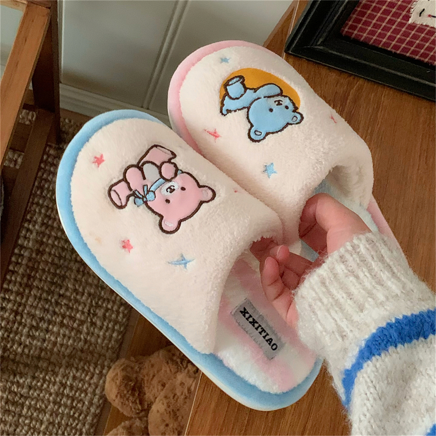 女趣味星星小熊棉拖鞋 舒适撞色秋冬季 防滑软底家用时尚 毛毛鞋 个性