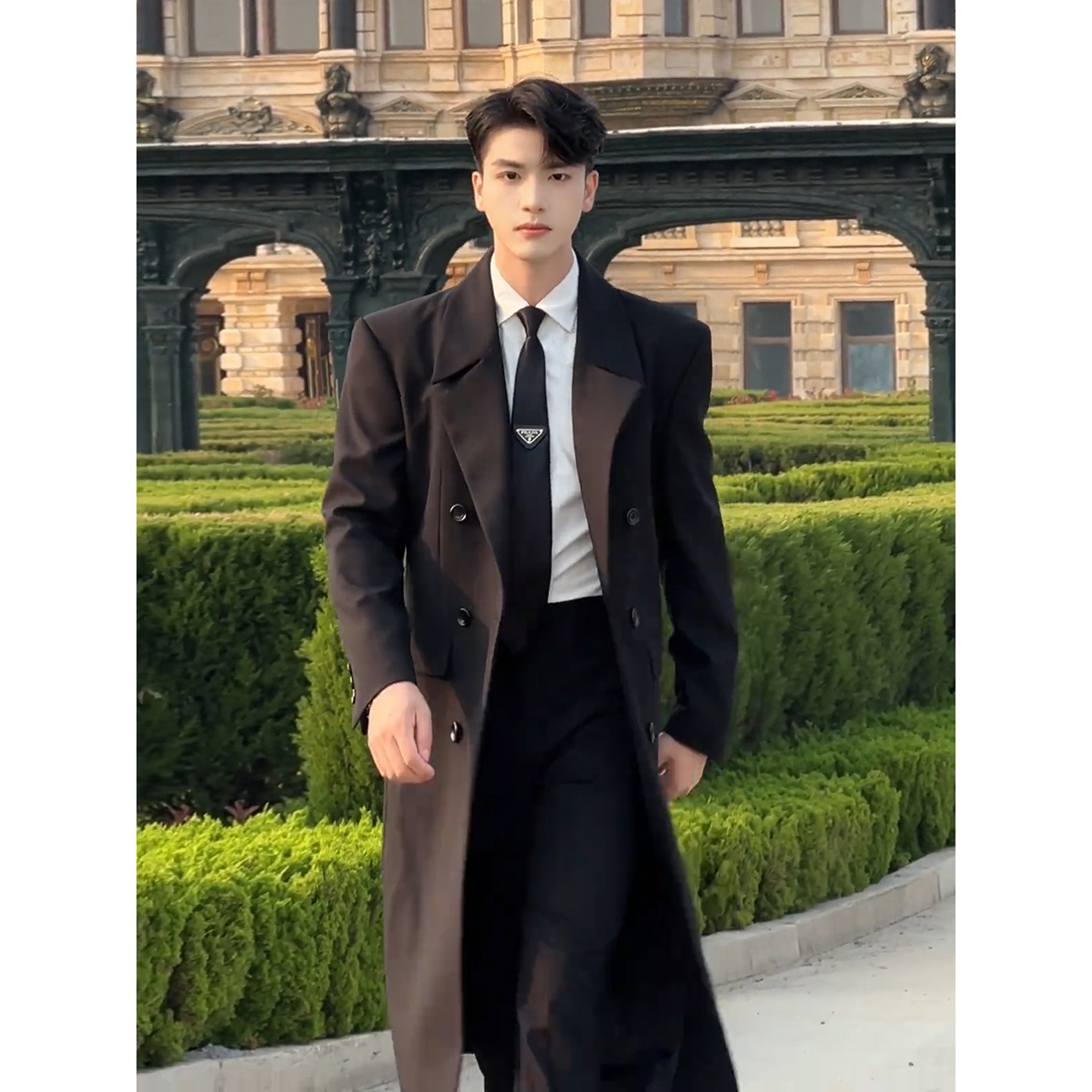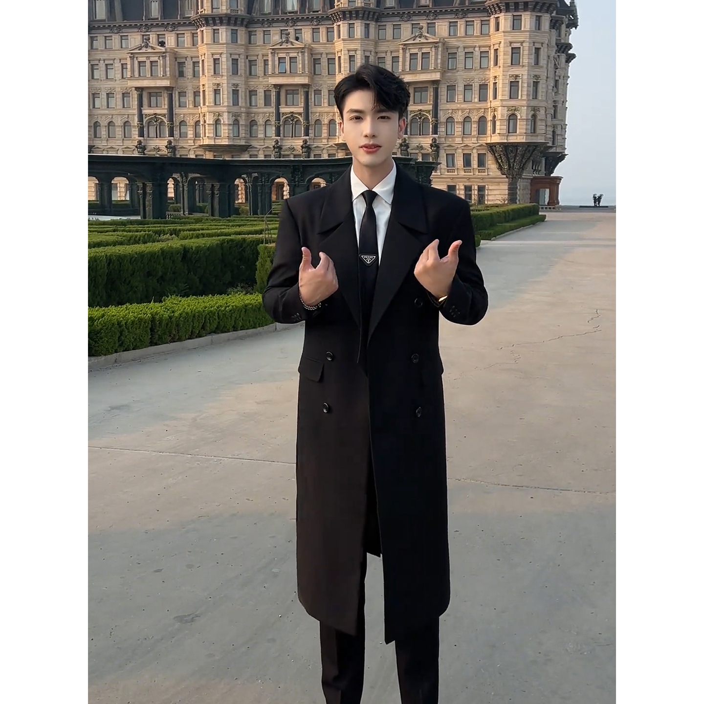 英伦风过膝正肩大衣 巴尔玛肯风衣韩版 黑色西装 创驳领风衣男中长款