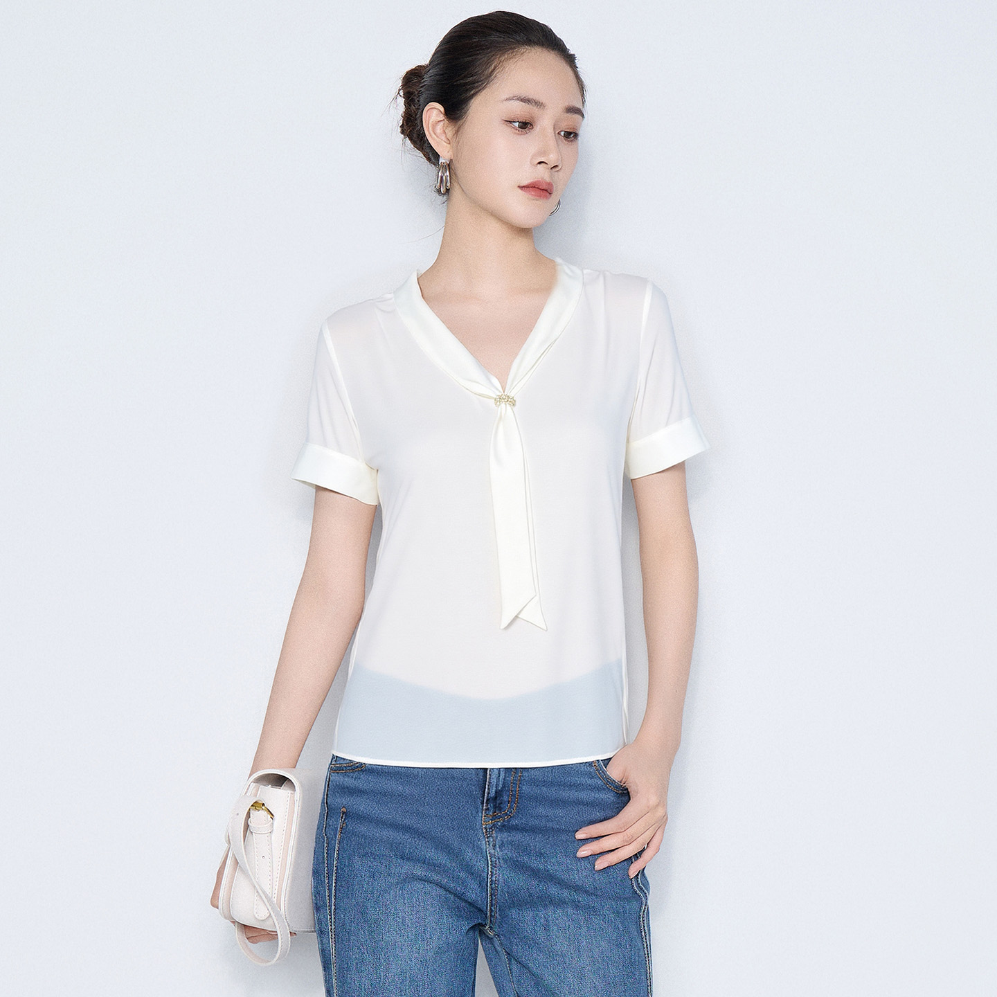 气质法式 马天奴2025秋冬新款 上衣衬衫 衬衫 女 奶油白飘带领钻扣短袖
