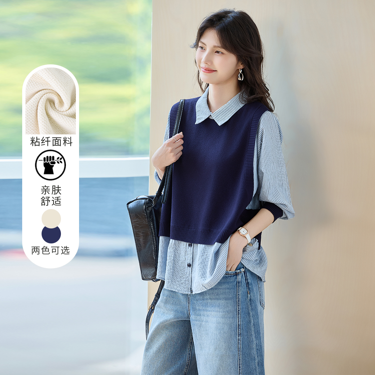 温柔文艺风假两件针织衫 新款 翻领条纹拼接显瘦减龄 2025秋季 3S女装
