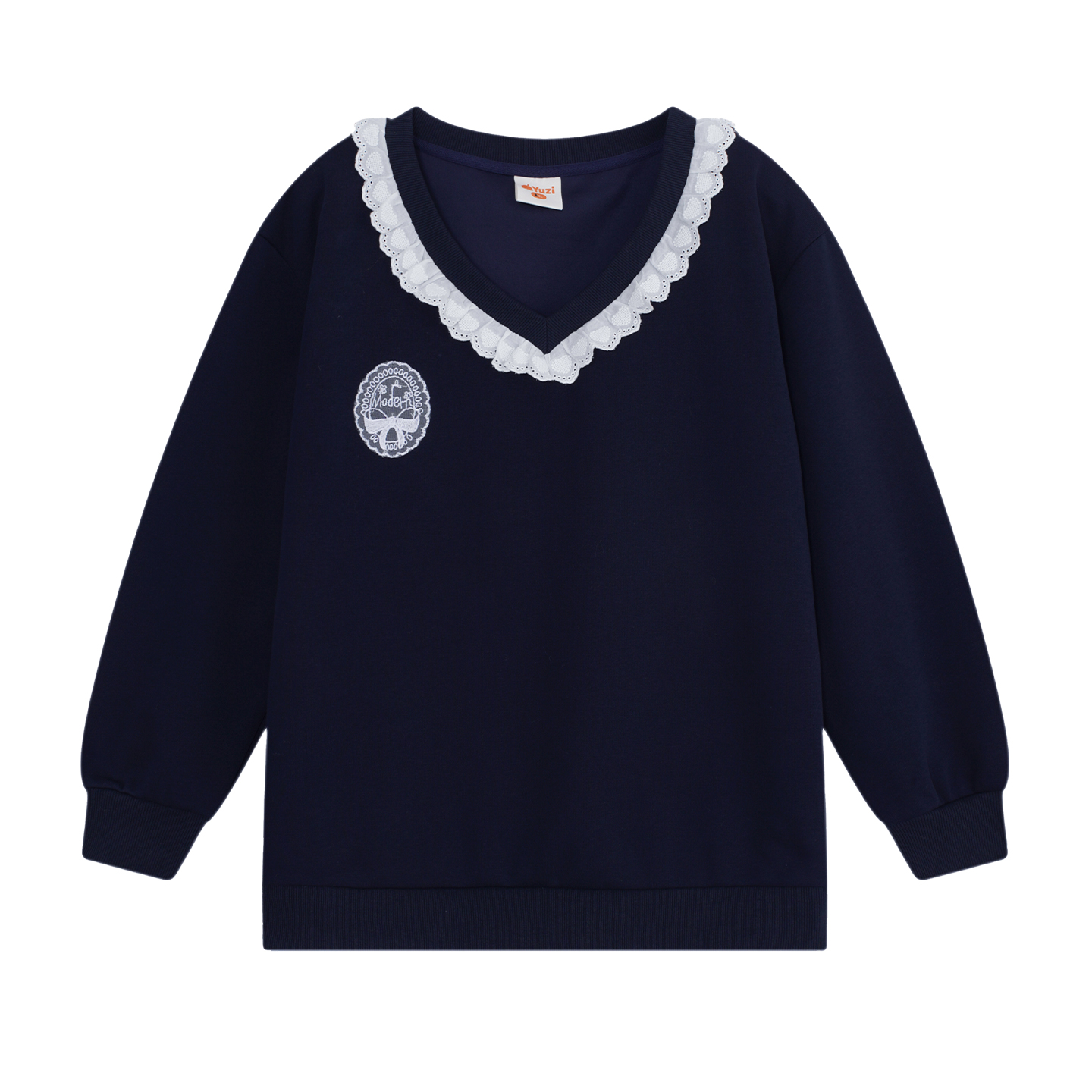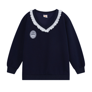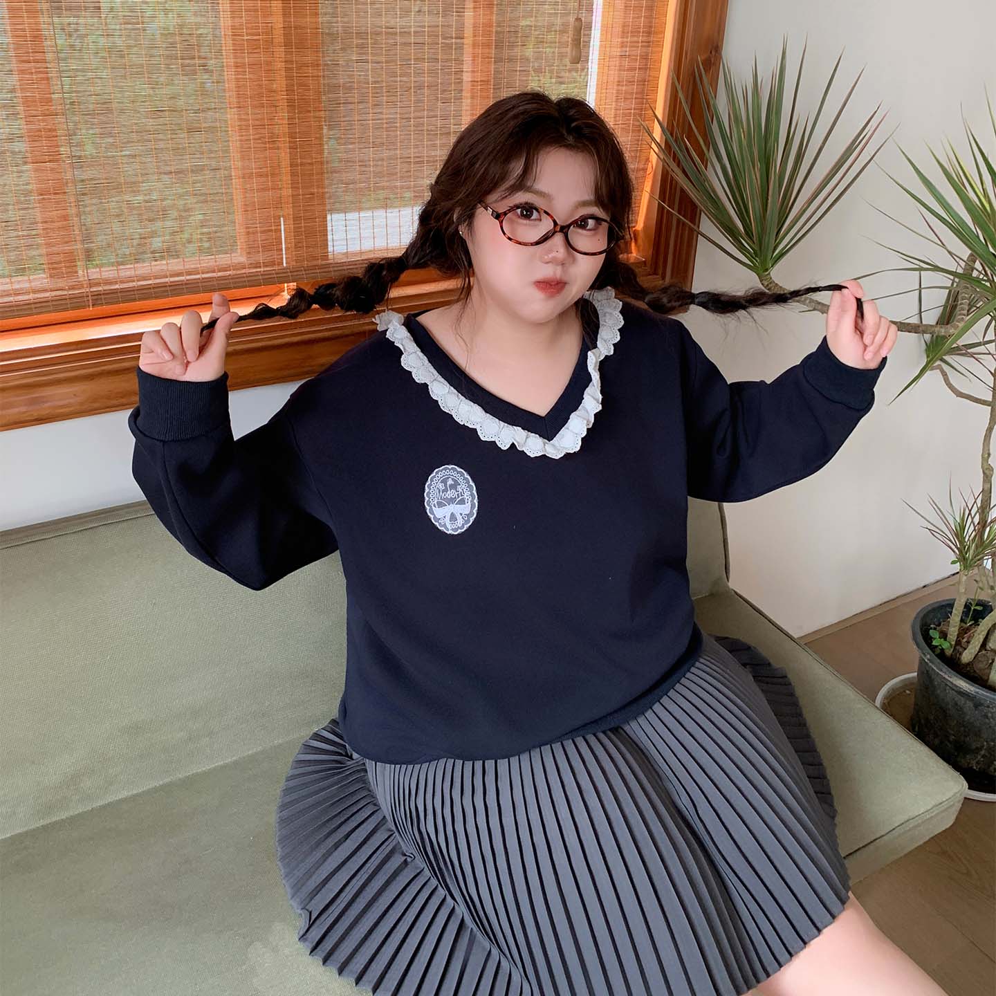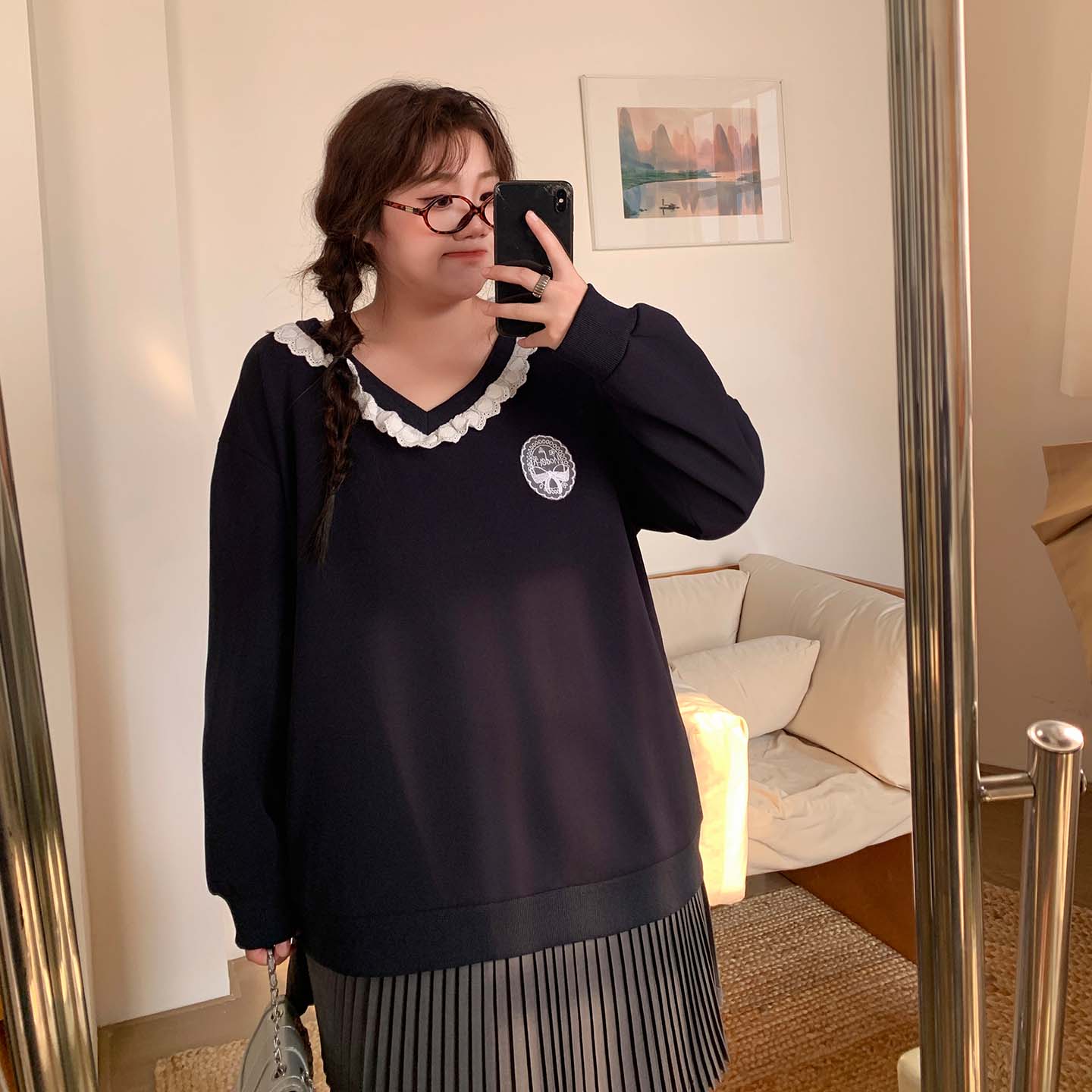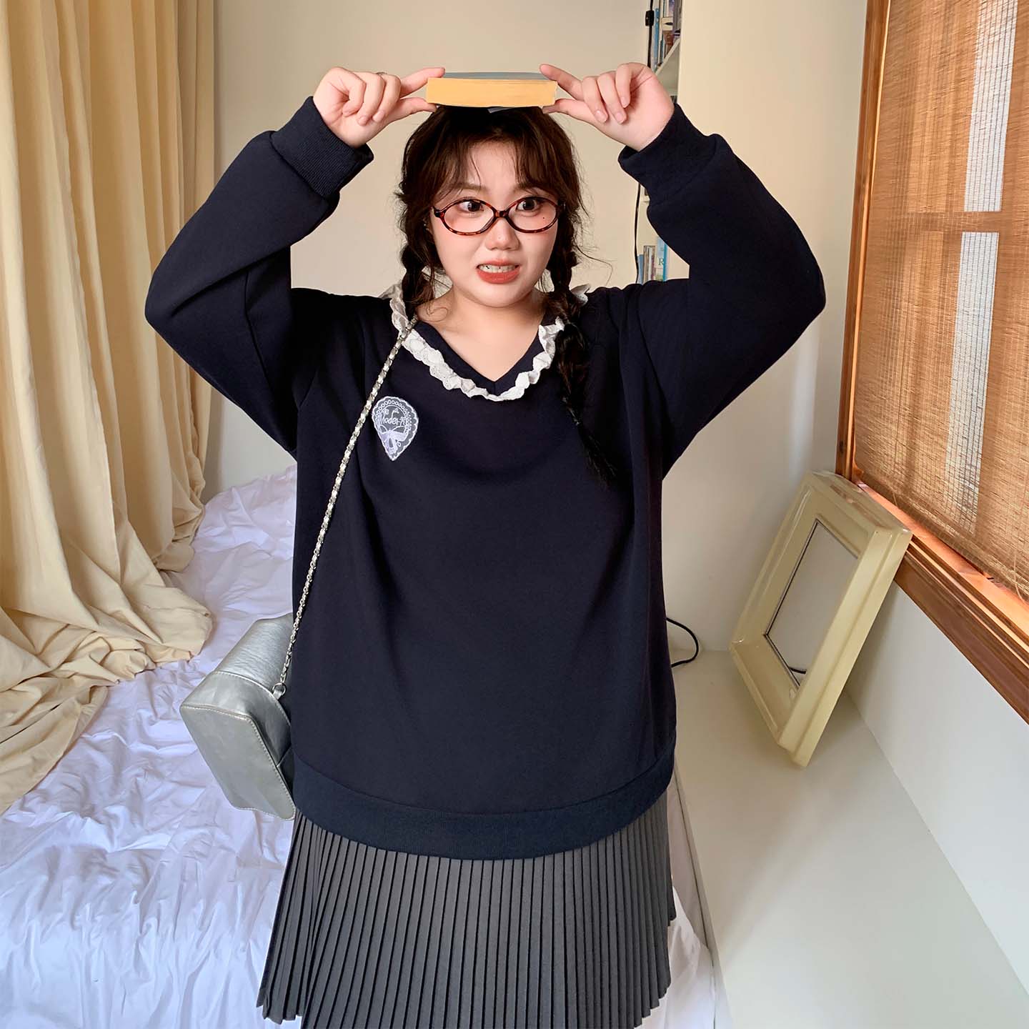减龄百搭胖mm甜美气质学院风 女装 YUZI 鱼子V领花边藏蓝色卫衣大码