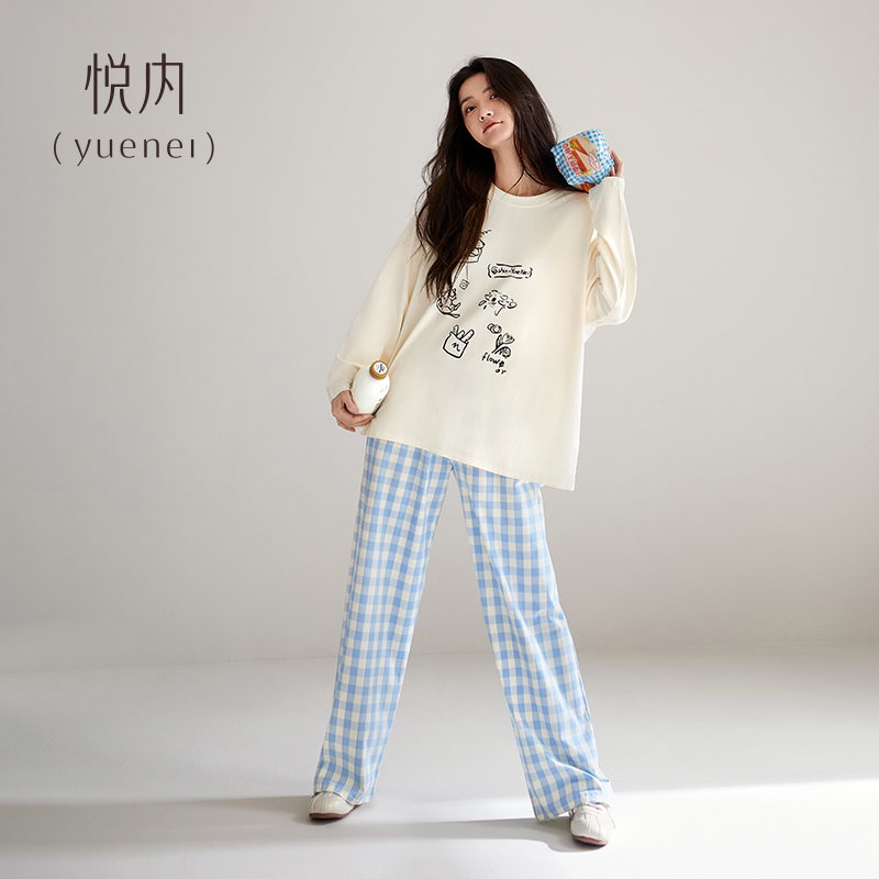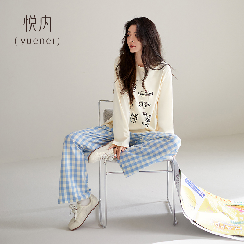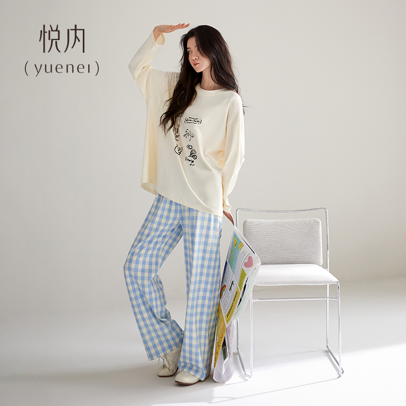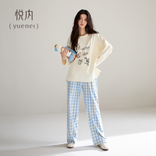家居服秋天休闲卡通格子可外穿 纯棉长袖 悦内带胸垫睡衣女款 春秋季
