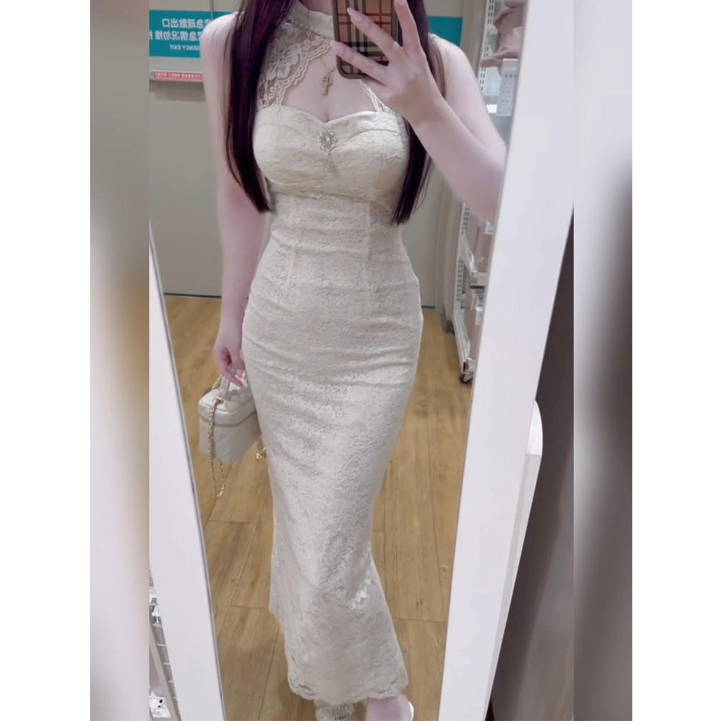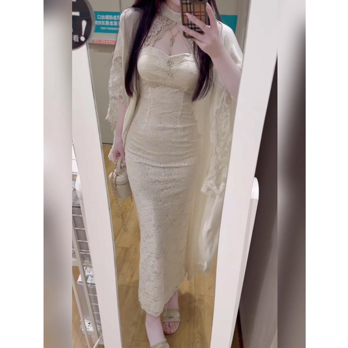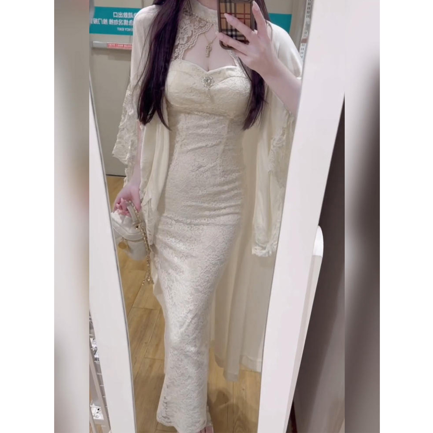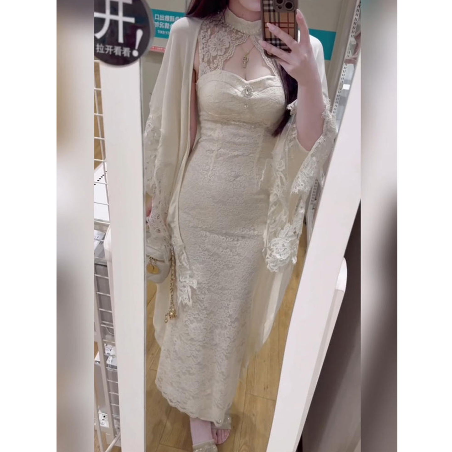套装 披肩开衫 微胖复古清冷感蕾丝挂脖旗袍裙女25年早秋新中式 XZY