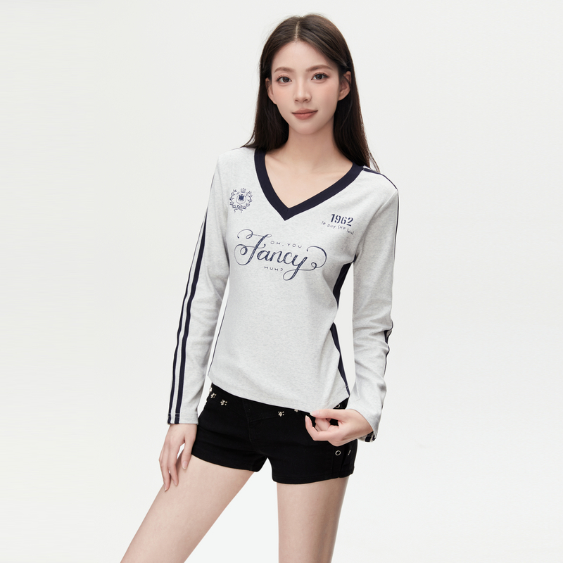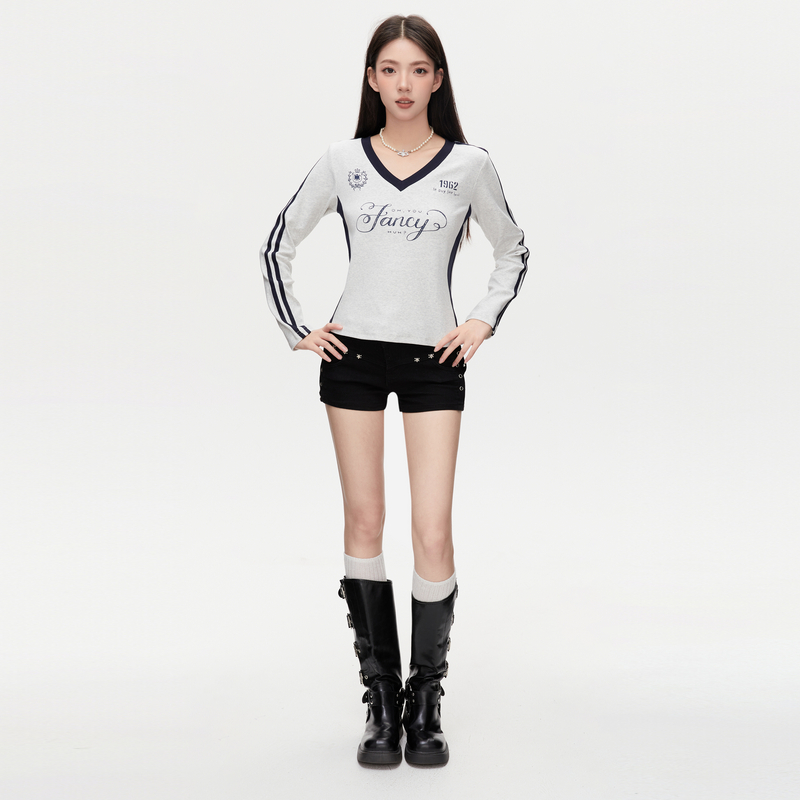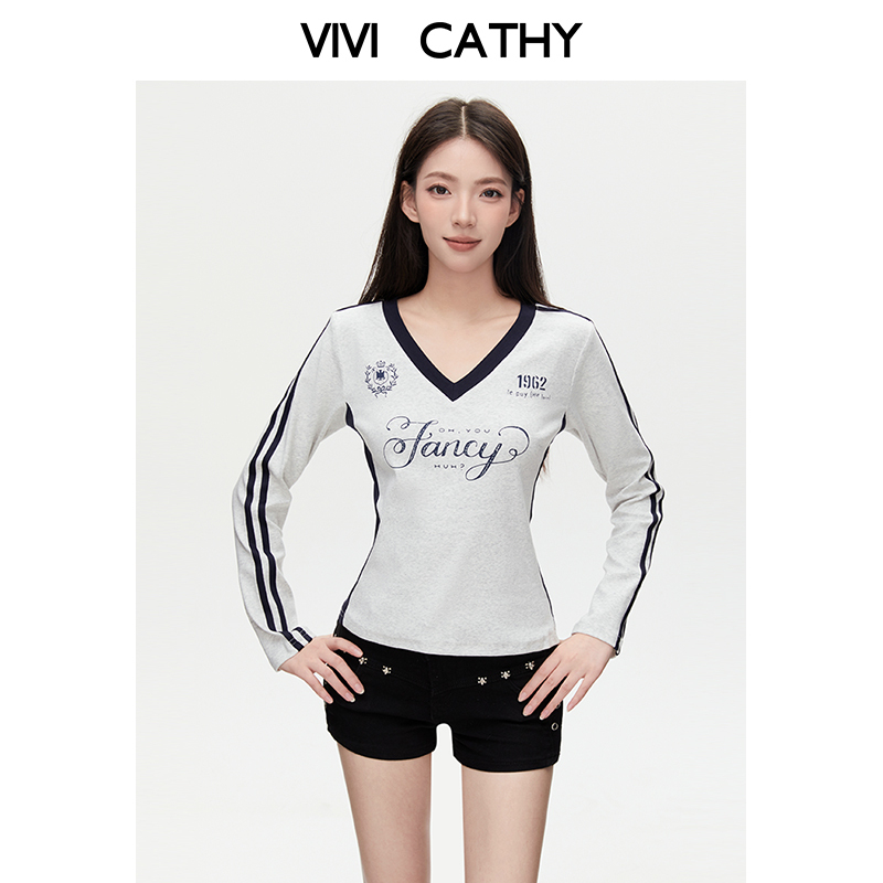 VIVICATHY2025秋浅灰V领长袖 收腰甜辣运动上衣 T恤女设计感修身